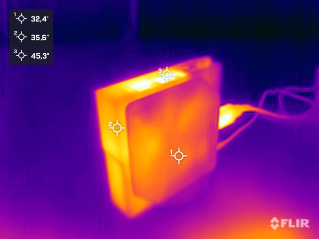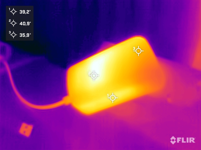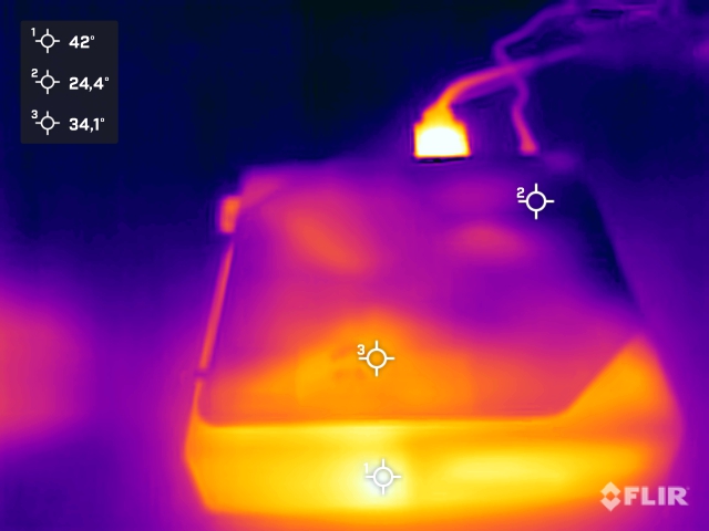 (±) Auf der Unterseite messen wir eine maximalen Wert von 44.6 °C (im Vergleich zum Durchschnitt von 36.5 °C).