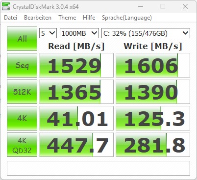 Acemagic bedient sich bei unserem S1 einer SSD aus dem Hause Netac. Das 512-GB-Modell nutzt die NVMe-Schnittstelle, womit gute Übertragungsraten erreicht werden. Allerdings wird die SSD nur mit 2 Lanes angebunden, womit die theoretische Bandbreite der SSD halbiert wird. In unseren Tests erreicht das verbaute Modell aber dennoch brauchbare Transferraten, woraus ein guter zweiter Platz resultiert. Unter Dauerbelastung sehen wir leichte Probleme, womit die Leistung zeitweise einbricht. Neben der bereits installierten SSD lässt sich noch ein weiterer Massenspeicher unterbringen. Allerdings handelt es sich dabei nur um eine NGFF-Schnittstelle (Next Generation Form Factor), welche nur M.2-SSDs mit SATA-Geschwindigkeit aufnehmen kann.