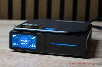 Als kleines Highlight bietet der Acemagic S1 ein kleines LCD-Display an der Vorderseite. Ist das Gerät ausgeschaltet, wird die aktuelle Uhrzeit angezeigt, während im eingeschalteten Zustand die wichtigsten Systeminformationen grafisch dargestellt werden. In der Software lässt sich die Oberfläche personalisieren und nach den eigenen Wünschen, im Rahmen der vordefinierten Profile, anpassen. Da der Acemagic S1 sowohl horizontal als auch vertikal verwendet werden kann, lässt sich die Ausrichtung der Anzeige natürlich auch dementsprechend drehen.