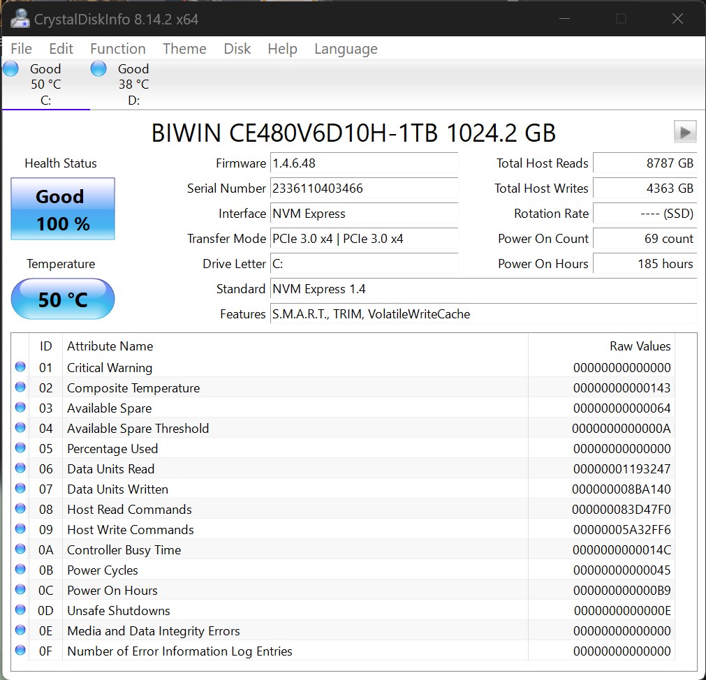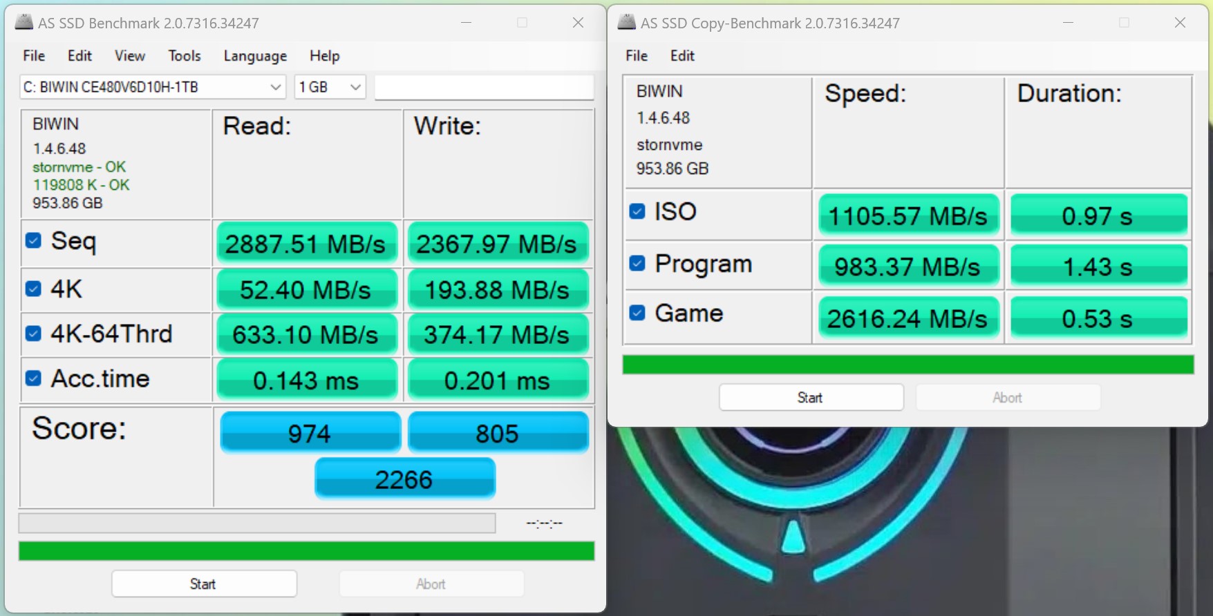 Unser Testsample des Acemagic ist mit einer 1.024-GB-SSD von BiWin bestückt. Die verbaute SSD unterstützt die PCIe-3.0-Geschwindigkeit, was sich auch anhand der Benchmarks erkennbar ist. Im direkten Vergleich hat es unser Testsample schwer, sich gegenüber der Konkurrenz zu behaupten. Die Position der SSD ist zudem nicht optimal gewählt, denn unter Last sehen wir hier einen deutlichen Leistungseinbruch bei Dauerlast. Unter der seitlichen Abdeckung gibt es kaum Luftzirkulation, welche hier für geringere Temperaturen sorgt. Insgesamt lassen sich zwei M.2-NVMe-SSDs im Tank03 unterbringen.