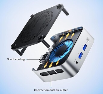Der Chip wird mit einem einzelnen, großen Lüfter gekühlt, durch die geringe Verlustleistung des Prozessors soll der Lüfter aber auch unter Last nicht lauter als 38 dB werden. Der Mini-PC kann mit bis zu 16 GB DDR4-3.200-Arbeitsspeicher sowie mit einer M.2-2280-SSD per PCIe 3.0 kombiniert werden. Neben den beiden Bildschirm-Anschlüssen stehen auch zweimal USB-A, zweimal USB-C (10 Gbit/s), Gigabit Ethernet und ein 3,5 mm Kopfhöreranschluss zur Verfügung. Der Acemagic V1 unterstützt Wi-Fi 5 und Bluetooth 4.2.