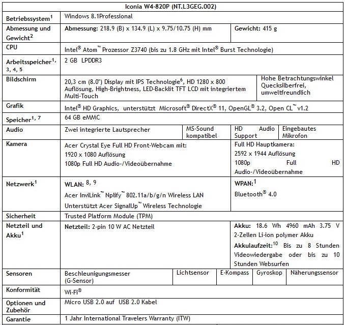 Bei der Ausstattung bieten auch die neuen Tablets der Reihe Acer Iconia W4-820P und 821P ein 8 Zoll großes Touchdisplay mit einer Auflösung von 1280 x 800 Pixeln, einen Intel Atom Z3740 Quadcore-Prozessor mit 1,8 GHz der Generation Bay Trail-T sowie jeweils 2 GByte Arbeitsspeicher. Über einen microSD-Steckplatz kann der Speicher um bis zu 32 GByte erweitert werden. Die Schnittstellenausstattung umfasst einen micro-HDMI-Anschluss sowie einen micro-USB-Port. Für Sicherheit sorgt ein integriertes Trusted Platform Module (TPM).