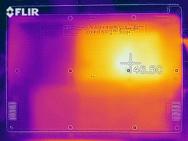 Das ARM-Notebook erwärmt sich insgesamt nur in geringem Maße. Während des Stresstests (Prime95 und Furmark laufen für mindestens eine Stunde) registrieren wir ein punktuelles Maximum von 46,5 Grad Celsius, das Gehäuse wird in der Summe aber nur handwarm. Im Alltagsbetrieb liegen die Temperaturen durchweg im grünen Bereich. Genaue Angaben zum CPU- und GPU-Takt können wir nicht machen, da die verwendeten Anwendungen diese nicht auslesen konnten.