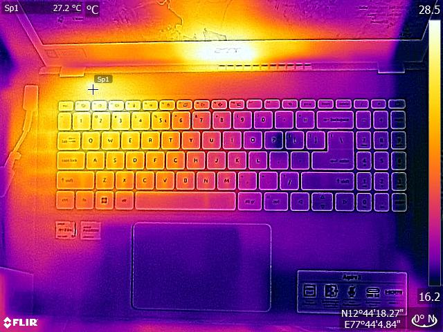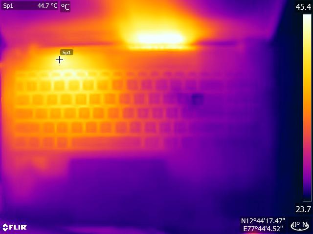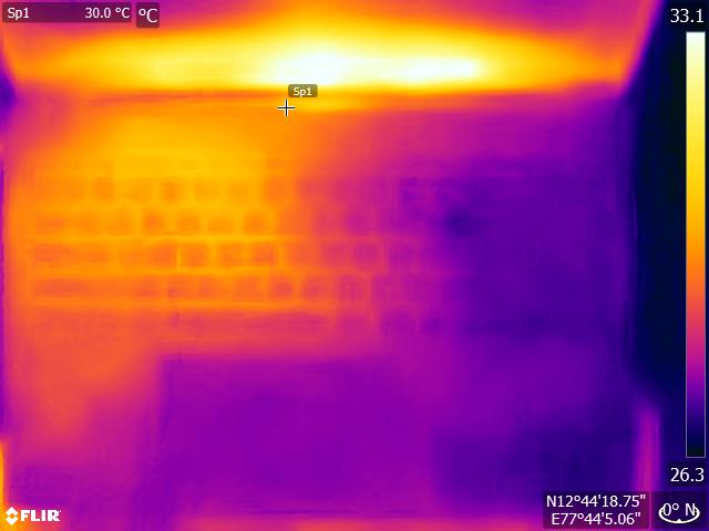 (+) Die Handballen und der Touchpad-Bereich erreichen maximal 32.2 °C und damit die typische Hauttemperatur und fühlen sich daher nicht heiß an.