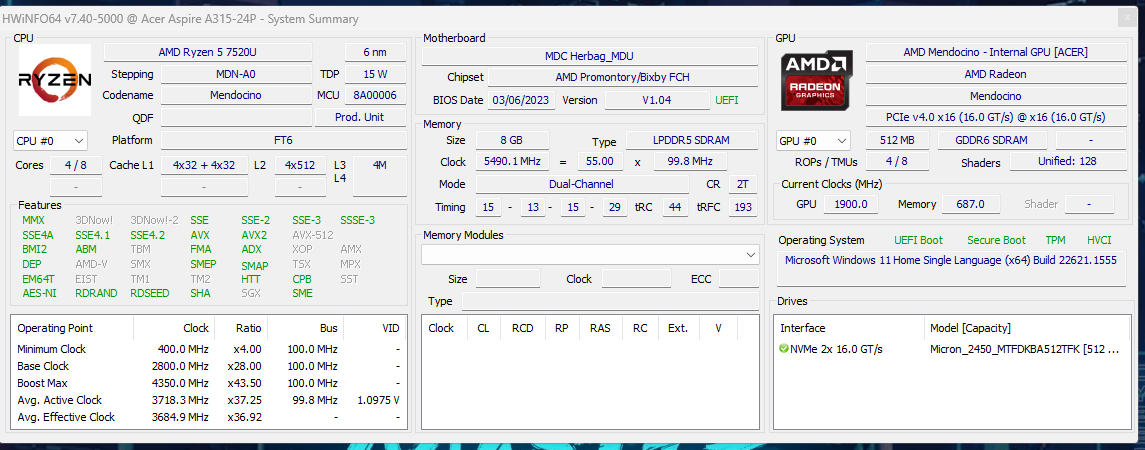 Bei der CPU kann man Acer nicht wirklich einen Vorwurf machen, da sie mit dem arbeiten muss, was AMD zu bieten hat. Um die Sache noch schlimmer zu machen: Der Ryzen 5 7520U ist der beste Mendocino Chip auf dem Markt. Es ist also nicht so, dass es höherwertige Angebote gibt, die seine schwache Leistung ausgleichen könnten.