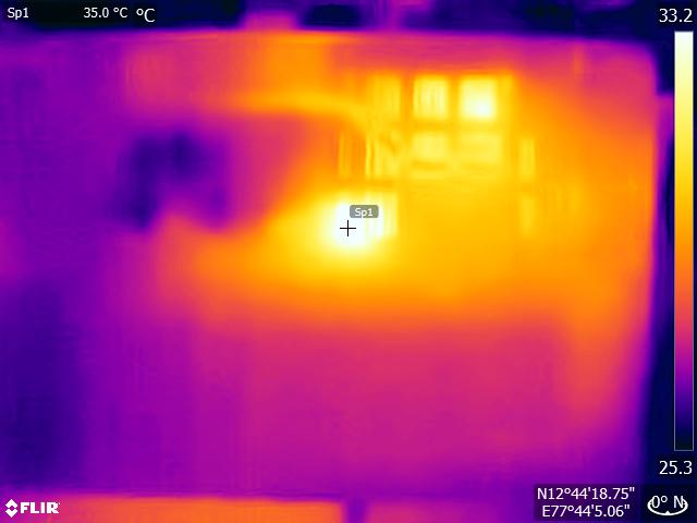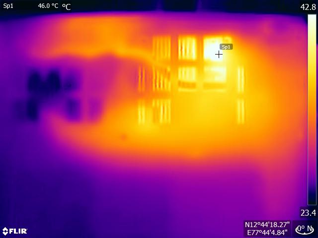 (-) Auf der Unterseite messen wir eine maximalen Wert von 63.6 °C (im Vergleich zum Durchschnitt von 36.8 °C).