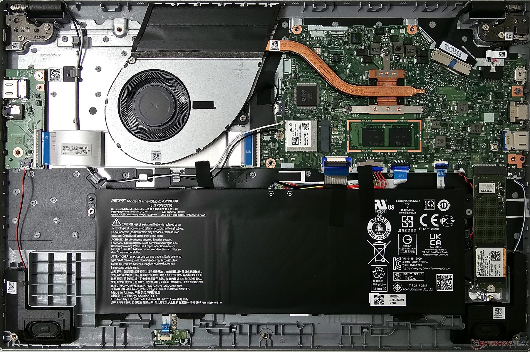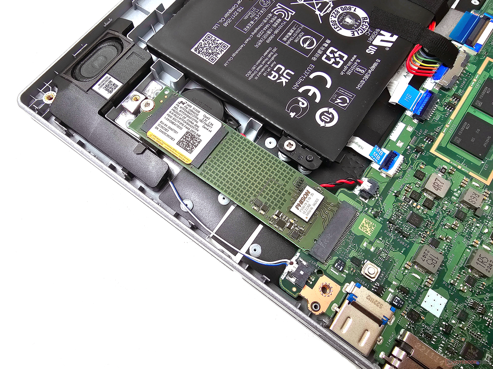 Um an die Innereien des Acer Aspire 3 zu gelangen, müssen elf Torx-T5-Schrauben gelöst werden, von denen eine unter einem Aufkleber mit der Aufschrift "Bei Bruch erlischt die Garantie" versteckt ist. Eine Speichererweiterung ist dank der Verwendung einer handelsüblichen SSD möglich. Der Arbeitsspeicher hingegen kann nicht erweitert werden, da er mit dem Motherboard verlötet ist. Das ist nicht unbedingt eine schlechte Sache, denn das Notebook profitiert von schnelleren LPDDR5-Modulen.