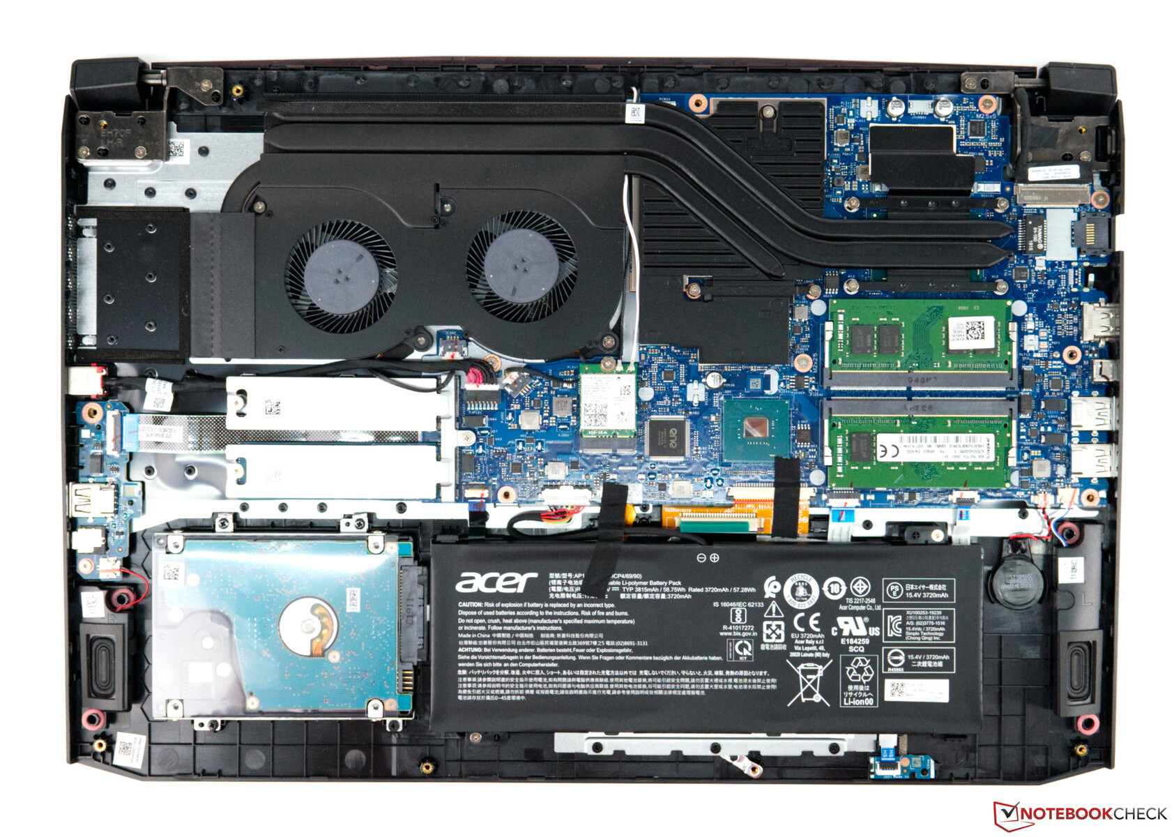 Obwohl das Acer Nitro 5 ein großes 17-Zoll-Notebook ist, so finden wir auf der Unterseite keine Wartungsklappe, welche das Aufrüsten bzw. Reinigen erleichtern würde. Wer an die Innereien möchte, muss die komplette Bodenplatte demontieren. Wir haben uns diesem Unterfangen gestellt und die Bodenabdeckung demontiert. Nach dem Entfernen der zahlreichen Schrauben sitzt die Abdeckung noch immer sehr fest an der Base. Viele kleine Halteklammern fixieren diese weiterhin und ohne geeignetes Hebelwerkzeug scheitert man schnell bei diesem Vorhaben. Nach dem Entfernen der Bodenplatte gelangt man gut an die wichtigsten Komponenten. Somit lässt sich der Arbeitsspeicher oder auch der Massenspeicher problemlos erweitern oder austauschen. Gleichwohl lassen sich der Gelegenheit auch die beiden kleinen Lüfter reinigen.