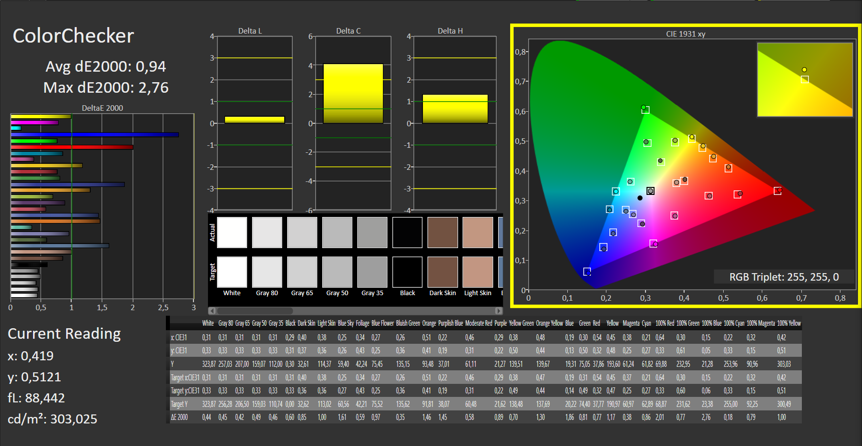 | Delta E Graustufen * | 1.75 | 3.6 -106% | 3.5 -100% | 4.31 -146% |