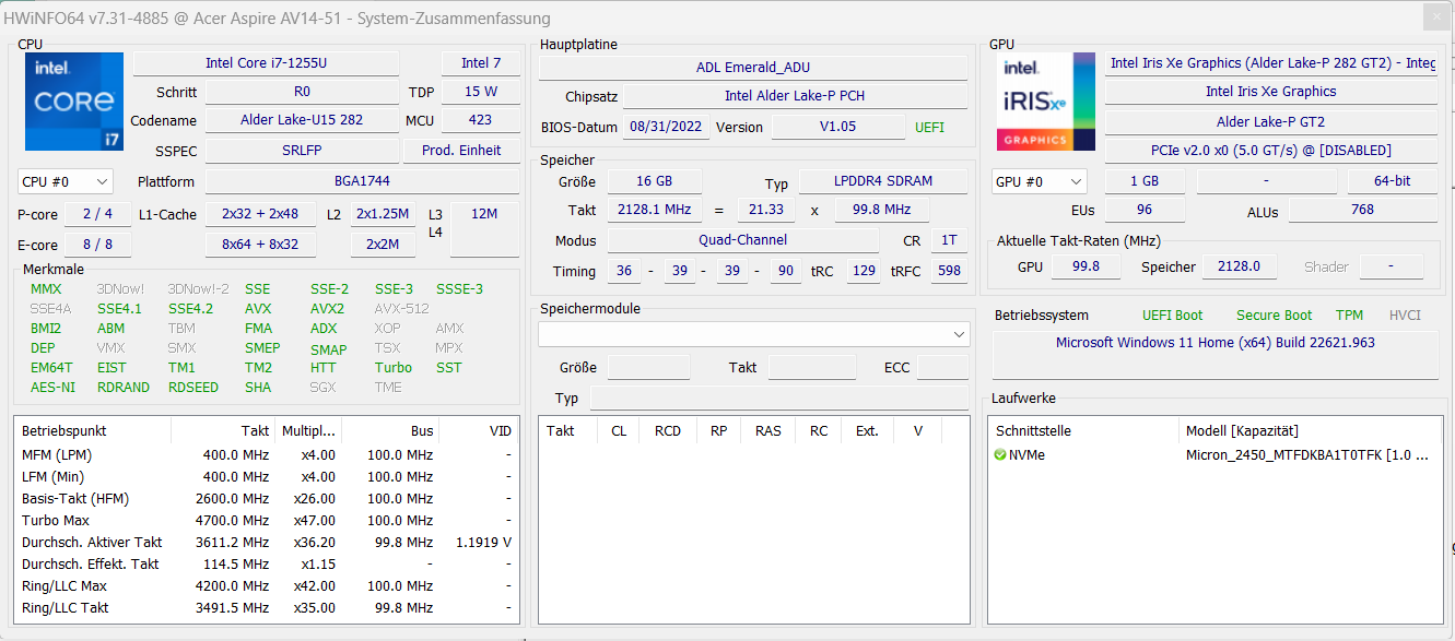 | Acer Aspire Vero AV14-51-72DL Iris Xe G7 96EUs, i7-1255U, Micron 2450 1TB MTFDKBA1T0TFK | Lenovo IdeaPad 5 Pro 14ITL6 Iris Xe G7 80EUs, i5-1135G7, WDC PC SN730 SDBPNTY-512G | HP Envy 14-eb0252ng Iris Xe G7 80EUs, i5-1135G7, Toshiba XG6 KXG60ZNV1T02 | Dell Inspiron 14 5425 6VPKR Vega 7, R5 5625U, SK Hynix BC711 512GB HFM512GD3GX013N | |