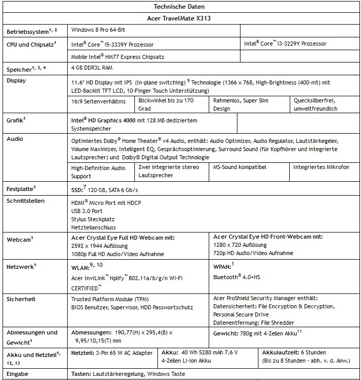 Acer nennt für das TravelMate X313 zwei mögliche Ausstattungsvarianten. Eine mit Intel Core i5-3339Y Dualcore-Prozessor und eine mit Core i3-3229Y. Bei den Onlinehändlern fanden wir allerdings bei einer Kurzrecherche lediglich das Modell TravelMate X313-M-5333Y4G12as (NX.V8LEG.001) mit Intel Core i5-3339Y, 4 GByte RAM, 120 GByte großer SSD und 11,6"-HD-Display (1.366 x 768 Pixel) zu Preisen von rund 1.210 bis 1.350 Euro.