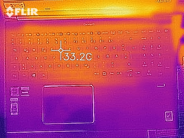 (+) Die Handballen und der Touchpad-Bereich sind mit gemessenen 29.6 °C kühler als die typische Hauttemperatur und fühlen sich dadurch kühl an.