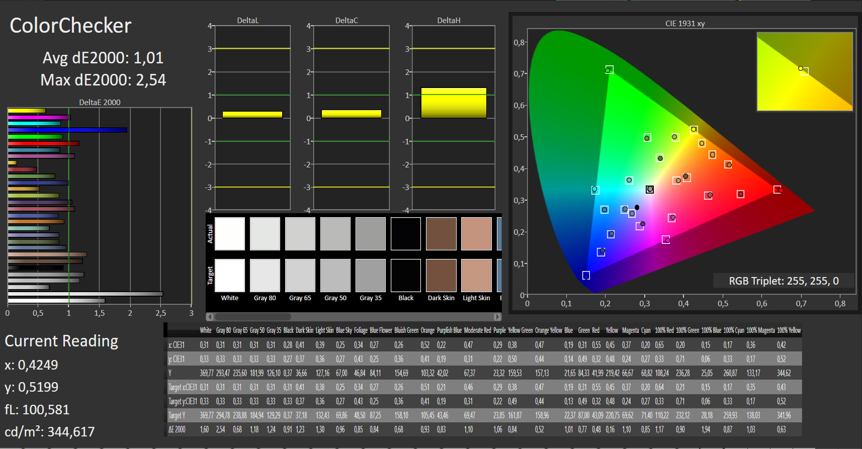 | Colorchecker dE 2000 calibrated * | 1.01 | 1.81 -79% | 4.39 -335% | 4.35 -331% | 2.95 -192% | 2.91 -188% |