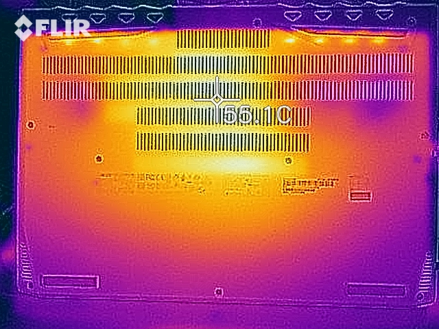 (-) Auf der Unterseite messen wir eine maximalen Wert von 57.2 °C (im Vergleich zum Durchschnitt von 39.2 °C).