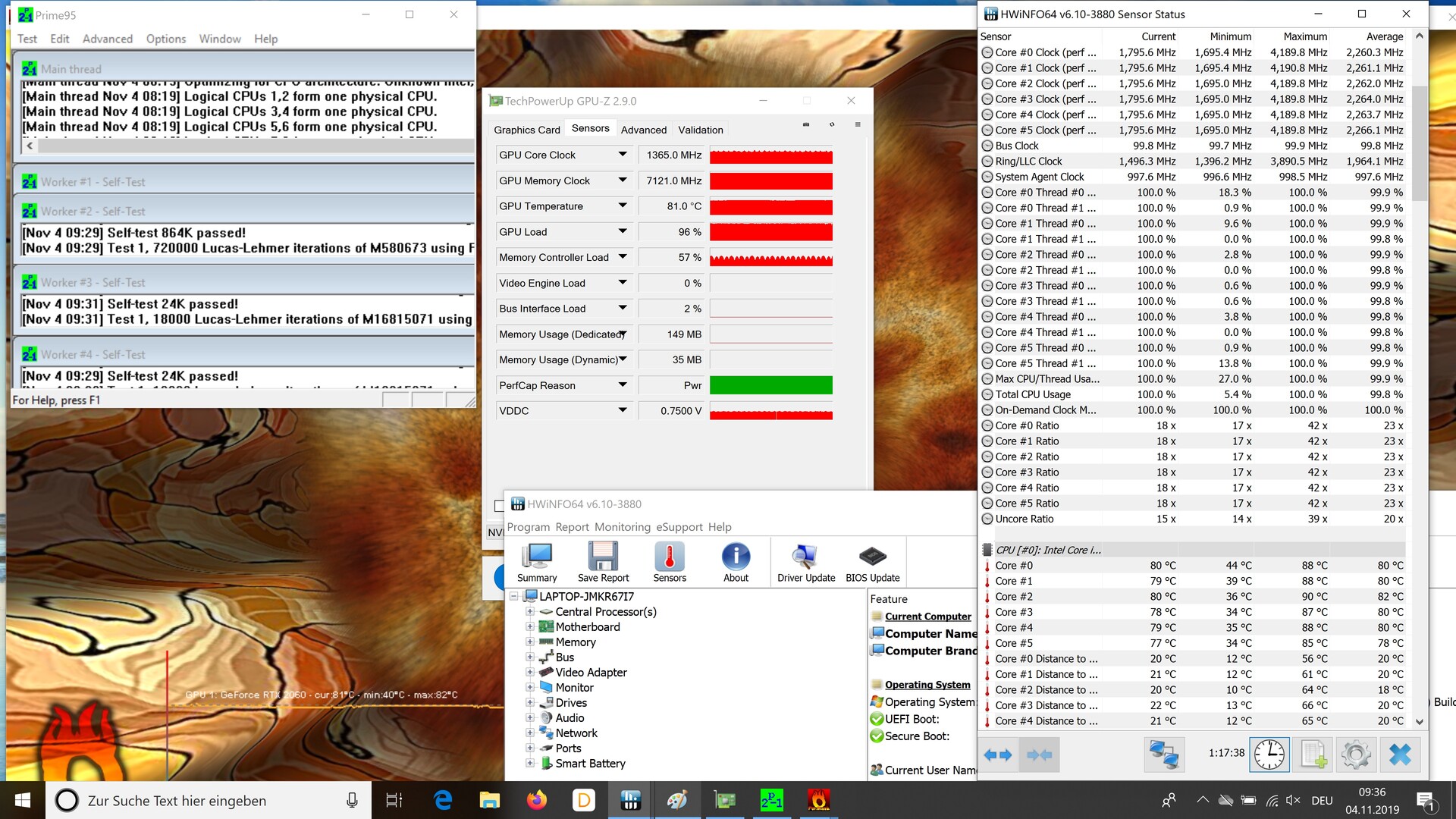 Die Kerntemperaturen sind dabei schnell durch das dünne Gehäuse an der Grenze, dann wird heruntergetaktet, und die Temperaturen pendeln sich letztlich bei etwas über 80 Grad Celsius ein.