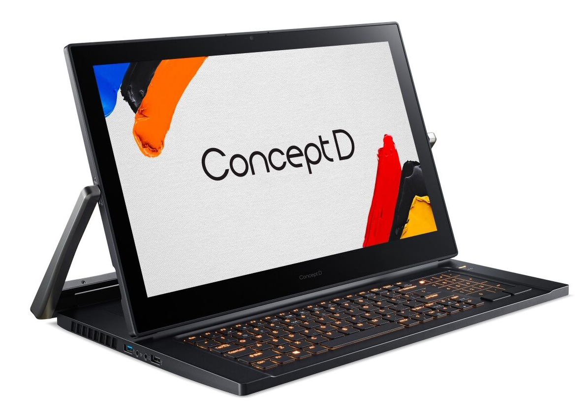 Die Technik des ConceptD steckt in einem schicken, gut verarbeiteten, stabilen Metallgehäuse. Die massiven Scharniere des Geräts fallen sofort ins Auge. Sie halten das Display in allen Betriebsmodi stabil in Position, was dem Nutzer eine komfortable Stifteingabe ermöglicht.