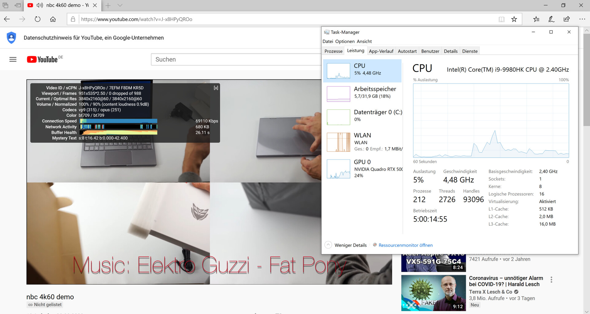 Im Inneren des Notebooks findet sich mit dem Core-i9-9980HK-Prozessor und der GeForce-RTX-5000-GPU aktuelle Technik. Während die CPU den Turbotakt schon nach kurzer Zeit verringern muss, kann der Grafikkern dauerhaft mit hohen Turbogeschwindigkeiten arbeiten. Der Thunderbolt-3-Steckplatz ermöglicht den Anschluss einer noch leistungsfähigeren externen GPU.