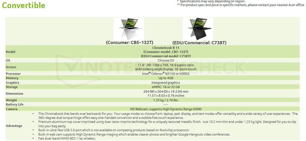 Für Consumer das Modell CB5-132T in der Farbe Weiß und für den Bildungs- und Businessbereich das C738T in Schwarz. Beide Ausführungen des Acer Chromebook R 11 laufen mit Chrome OS als Betriebssystem und werden entweder von einem Intel Celeron N3150 oder Celeron N3050 der Braswell-Generation angetrieben (modellabhängig). Als Speicher stehen bis zu 4 GB RAM und 16 oder 32 GB lokaler eMMC zur Verfügung.