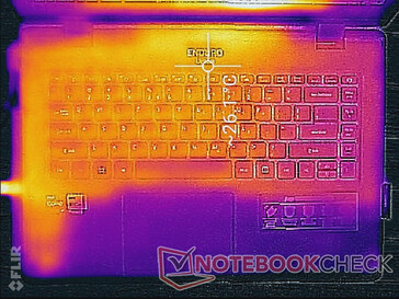Die Oberflächentemperaturen sind auf der linken Seite des Laptops höher als auf der rechten, was auf die Ausrichtung der Kühllösung zurückzuführen ist. Die wärmsten Stellen erreichen bis zu 37 und 46 °C auf der Ober- bzw. Unterseite, während das Durabook S14I auf beiden Seiten unter ähnlichen Bedingungen maximal 39 °C erreicht.