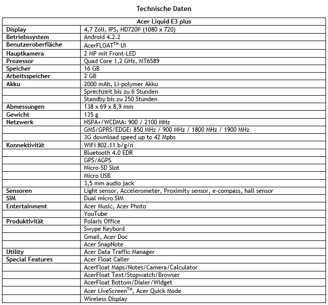 Brunn am Gebirge, 16. April 2014 – Mit dem Liquid E3 plus stellt Acer das neue Flaggschiff seiner Liquid E-Serie vor. Das neue Gerät wurde besonders für Anwender entwickelt, die ihr Leben gerne auf Fotos festhalten und mit Freunden und Familie teilen wollen. Das 11,93 cm (4,7 Zoll) HD-Display mit IPS Technologie sorgt dabei auch in einem größeren Betrachtungswinkel für brillante Fotos in lebensechten Farben. Lediglich 135 Gramm leicht, ist das Acer Liquid E3 plus der ideale Begleiter für unterwegs und gestattet mit seinem griffigen, ergonomischen Design eine spielend leichte Handhabung. Der integrierte 1,2 GHz Quad Core-Prozessor bietet reichlich Power für Multitasking und Gaming. Das Acer Liquid E3 plus glänzt zudem mit üppiger Speicherausstattung: 2 GB Hauptspeicher sorgen für jederzeit flüssige Bedienung. 16 GB Speicher, per Micro-SD-Karte erweiterbar, stellen riesige Platzreserven zur Verfügung – ideal um die schönsten Augenblicke im Leben festzuhalten. Android 4.2.2. steht für hohen Bedienkomfort und umfassende Funktionalität. Ein Update auf Android 4.4. KitKat ist angekündigt. Das neue Acer Liquid E3 plus ist ab sofort zu einem unverbindlich empfohlenen Endkundenpreis (inkl. MwSt.) von 249,- Euro im Handel erhältlich.