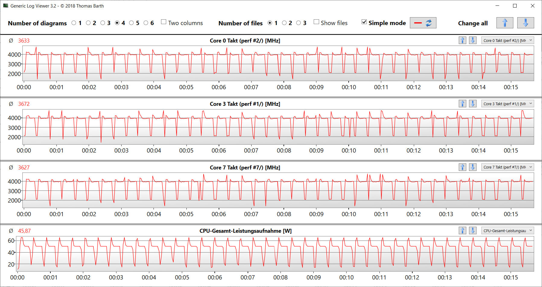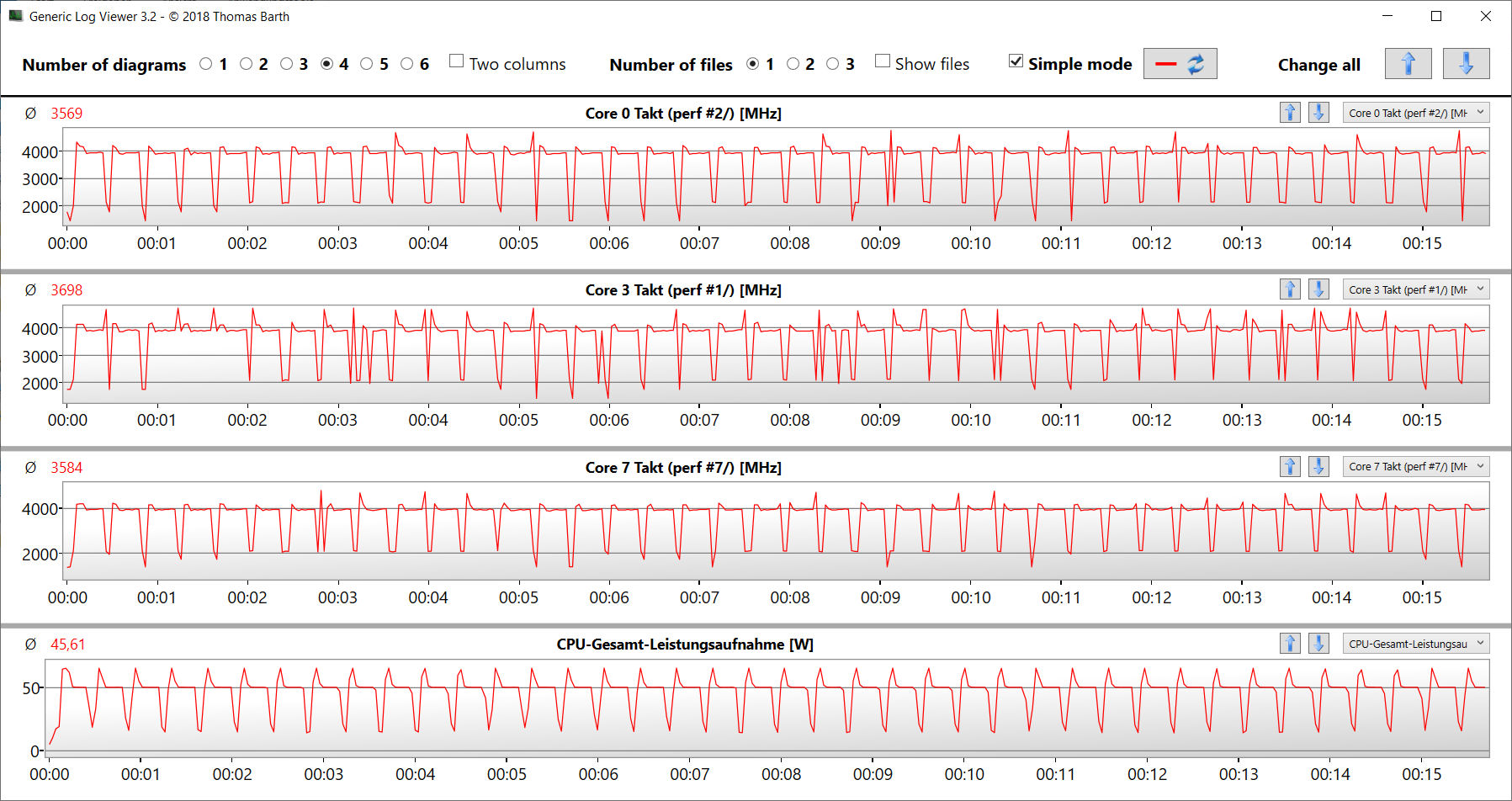Der Multi-Thread-Test des Cinebench-R15-Benchmarks wird mit 4 bis 4,2 GHz bearbeitet, der Single-Thread-Test mit 2 bis 4,75 GHz. Im Akkubetrieb geht die CPU mit 2,5 GHz (Multi-Thread) bzw. 1,2 bis 2,5 GHz (Single-Thread) zu Werke. Eine dauerhafte Nutzung des CPU-Turbos bestätigt der CB15-Schleifentest.