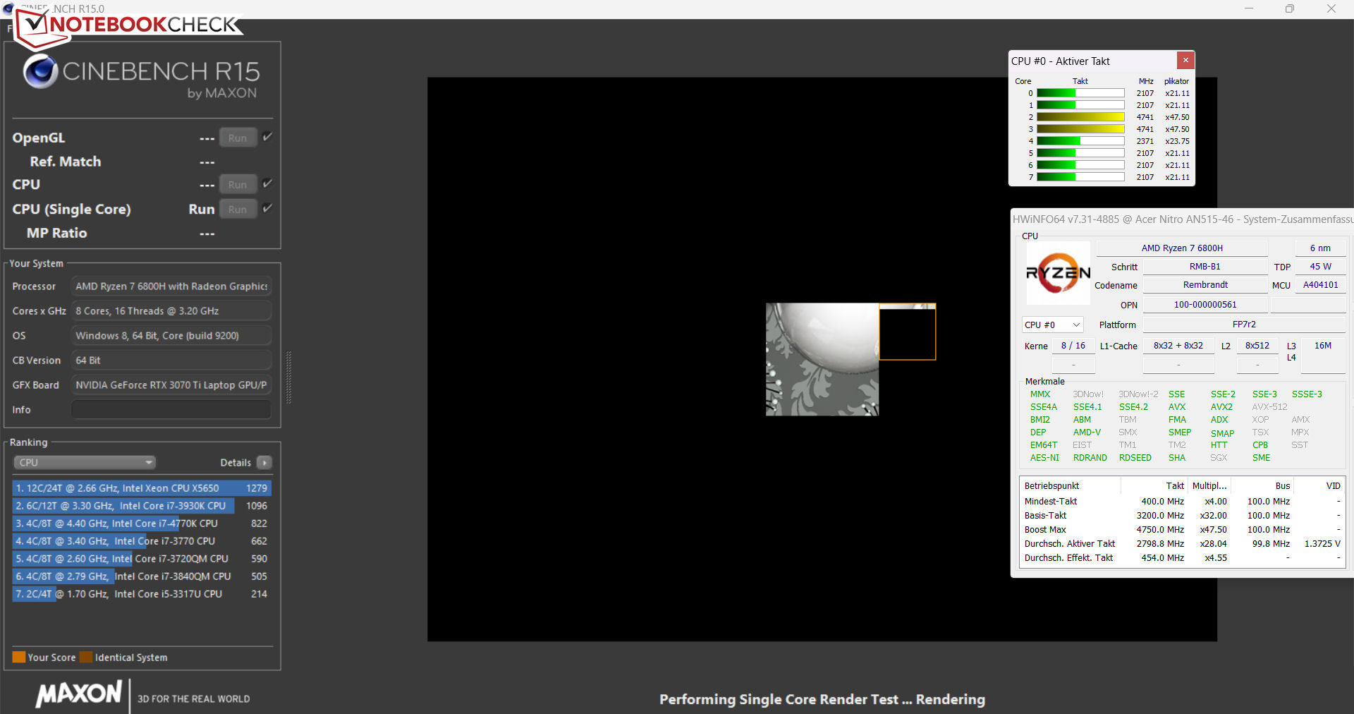 Der CPU-Teil der Ryzen-7-6800H-APU (Rembrandt) besteht aus einem Achtkernprozessor, der mit einem Basistakt von 3,2 GHz arbeitet. Mittels Turbo ist eine Steigerung auf bis zu 4,75 GHz möglich. Simultaneous Multithreading (zwei Threads pro Kern) wird unterstützt. Die Resultate in den CPU-Benchmarks fallen unter allen drei Leistungsprofilen gleich aus.