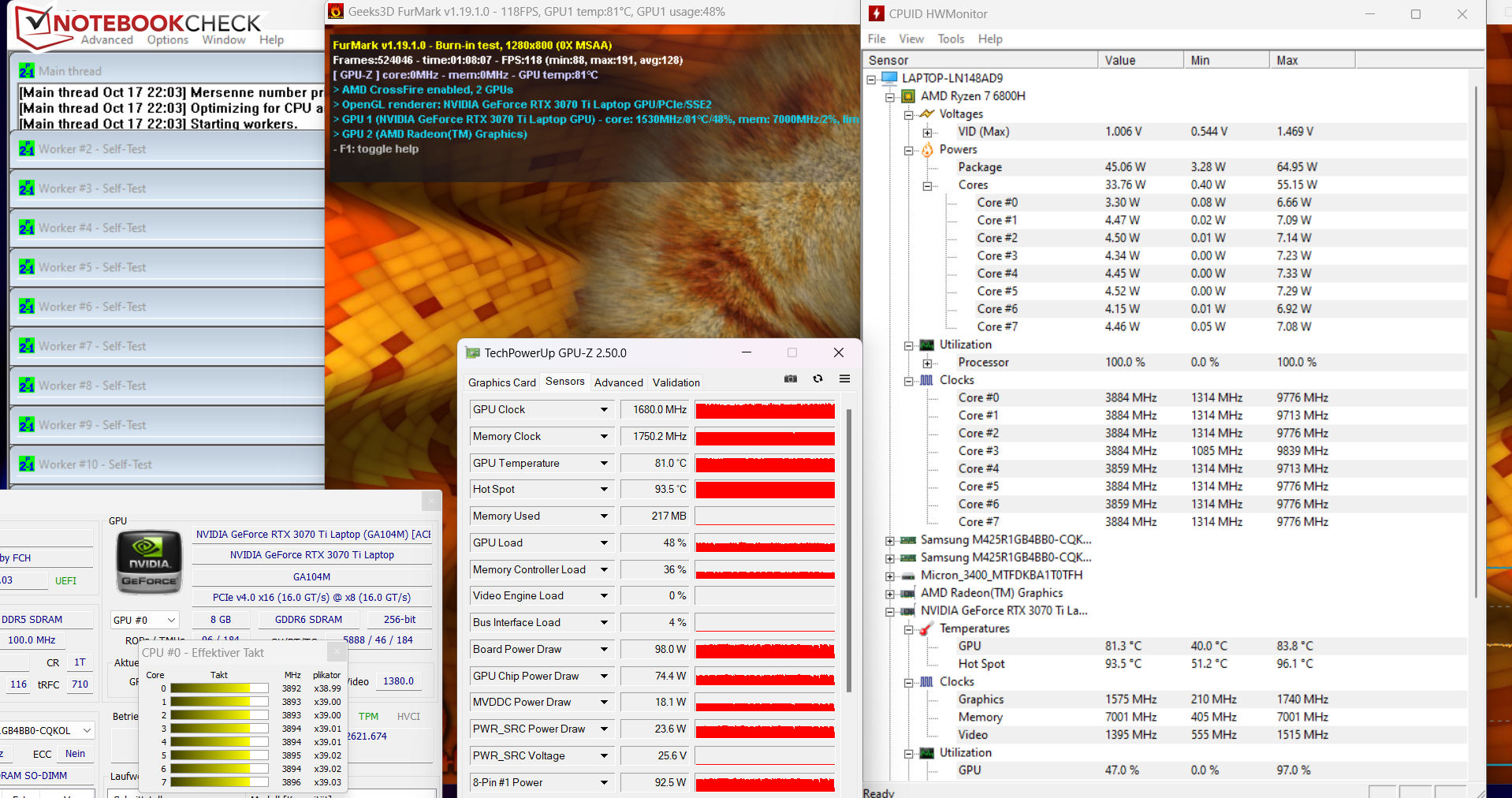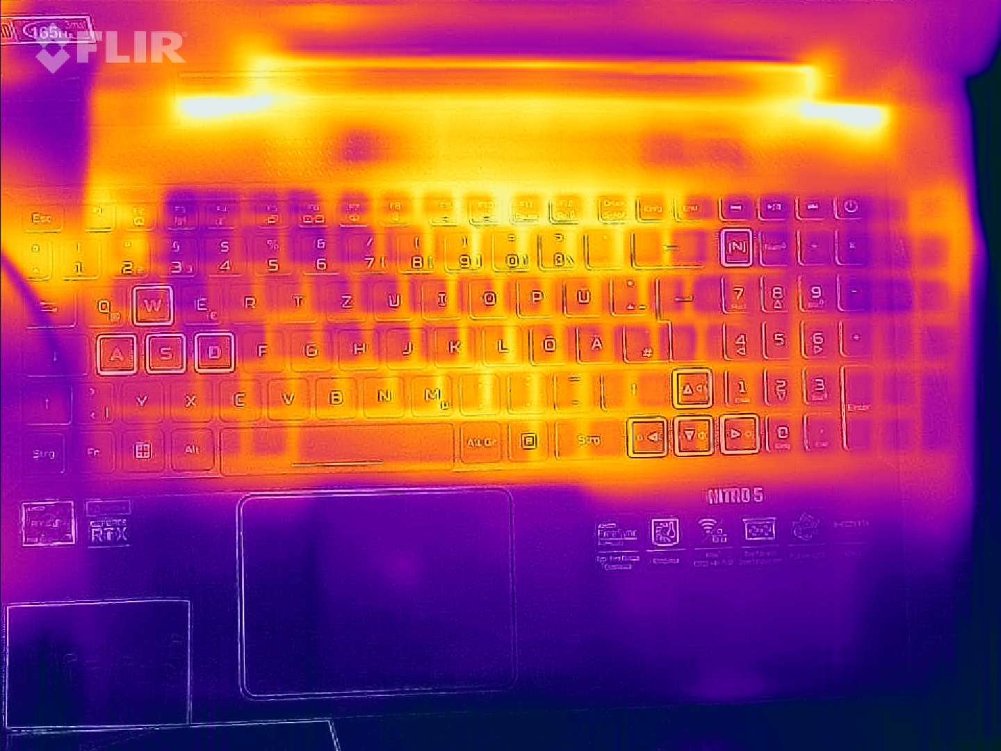 CPU und GPU können mit konstant hohen Taktraten arbeiten. Positiv: Der Rechner erwärmt sich unter Last nur moderat. Allerdings bewegt sich die Lärmentwicklung auf klassenüblichem Niveau - der Rechner wird laut. Der matte 15,6-Zoll-Bildschirm (FHD, IPS, 165 Hz) hat weitgehend einen guten Eindruck hinterlassen.