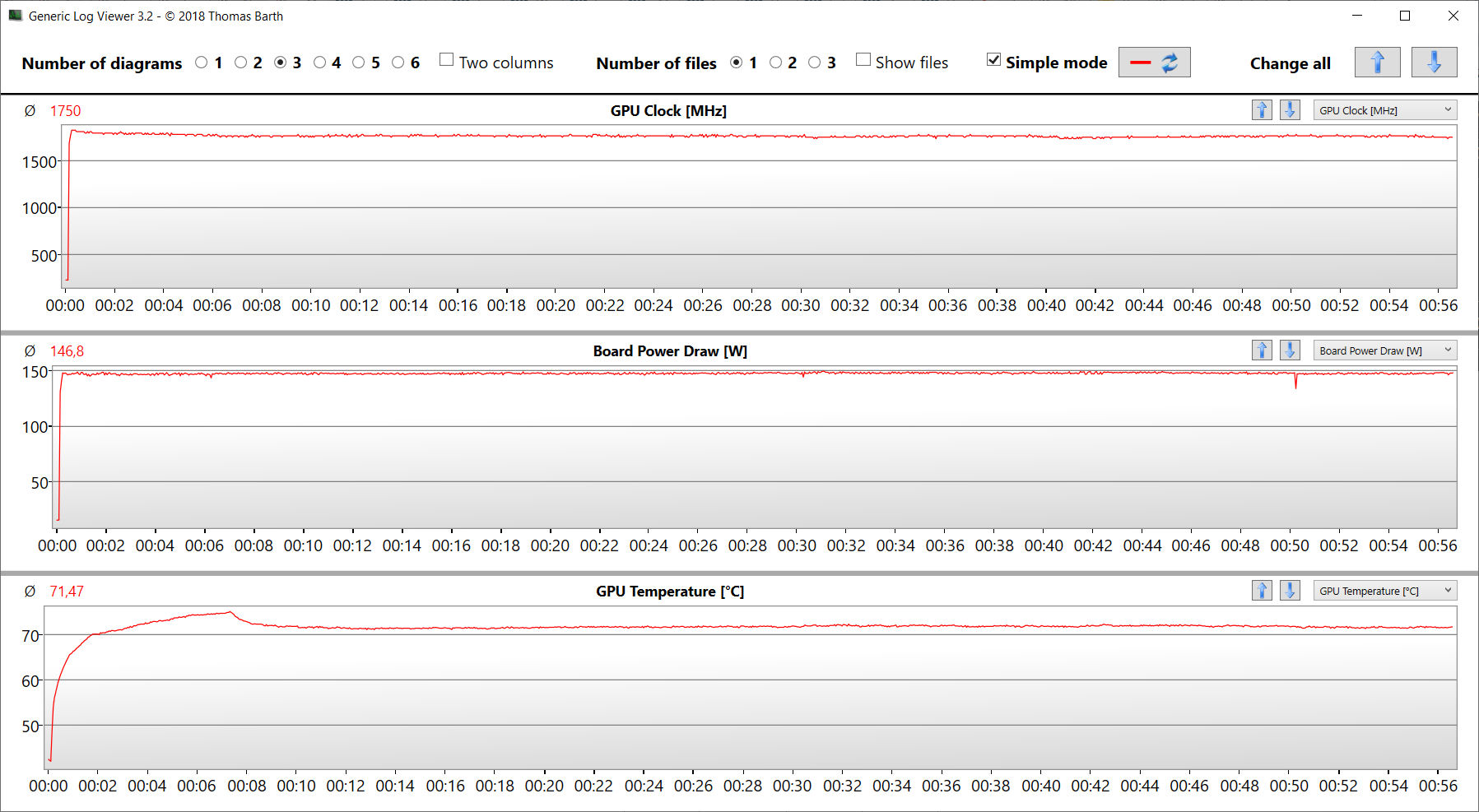 Der Stresstest (Prime95 und Furmark im Dauerbetrieb) stellt ein Extremszenario zur Überprüfung der Systemstabilität unter Volllast dar. CPU (4,2 bis 4,3 GHz) und GPU (1.000 bis 1.600 MHz) beginnen den Test mit hohen Taktraten. Während der CPU-Takt im Verlauf des Tests leicht sinkt, stabilisiert sich der GPU-Takt auf hohem Niveau.