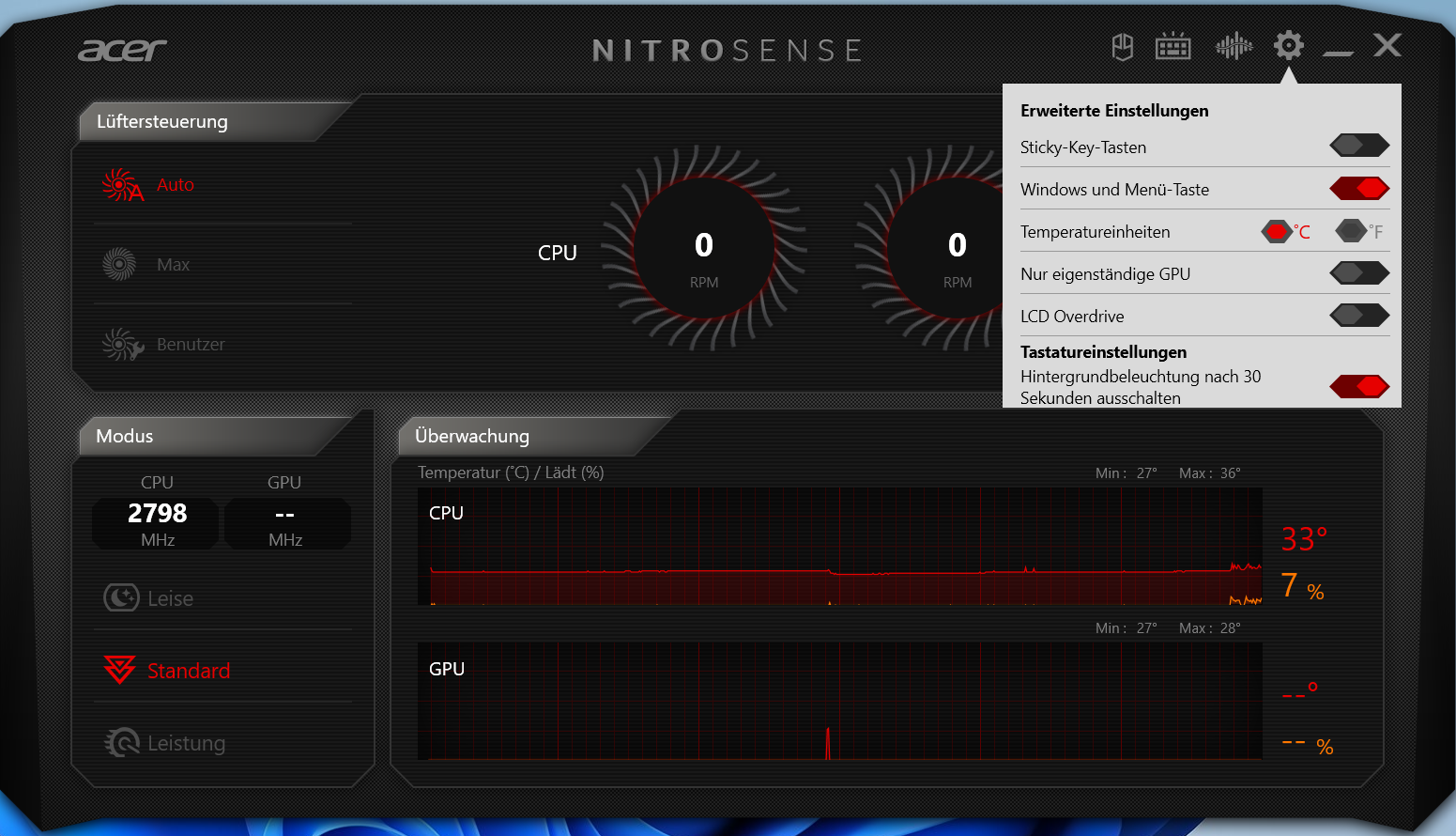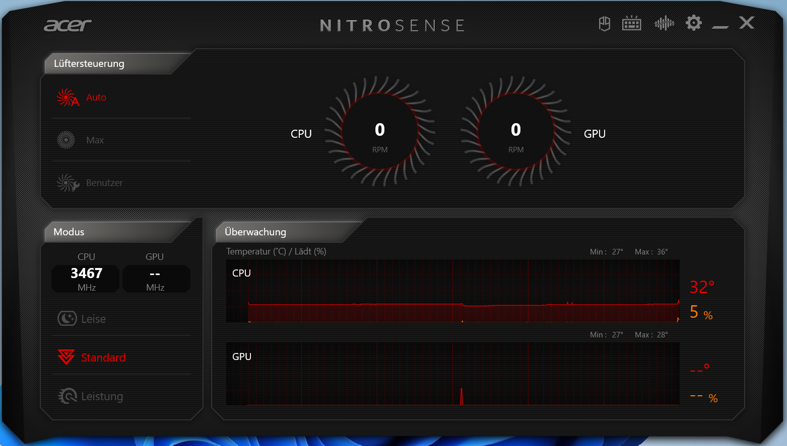 Zwischen den herstellerspezifischen Leistungsprofilen ("Leistung", "Standard", "Leise") kann per vorinstallierter NitroSense-Software (siehe Bilder) - dem Kontrollcenter des Laptops - umgeschaltet werden kann. Der Test wurde bei aktivem Profil "Standard" samt automatischer Lüftersteuerung durchgeführt. Die CPU-Leistung fällt unter allen drei Leistungsprofilen gleich aus, die GPU-Leistung unterscheidet sich minimal.