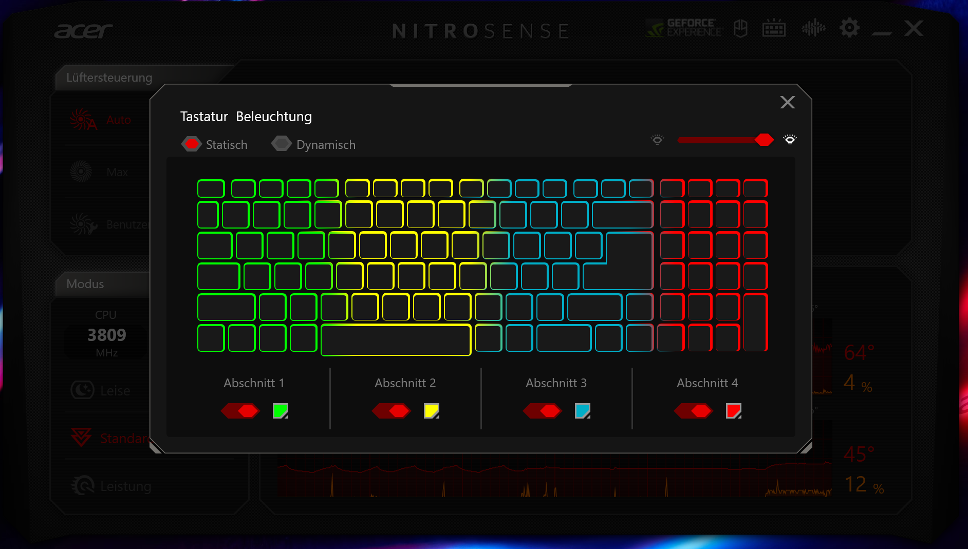 Der Acer Rechner verfügt über drei herstellerspezifische Leistungsprofile ("Leistung", "Standard", "Leise"), zwischen denen per vorinstallierter NitroSense-Software umgeschaltet werden kann. Das "Leistung"-Profil ist nur im Netzbetrieb nutzbar. Die Akkutests wurden bei aktivem Profil "Leise" durchgeführt, die Benchmarks bei aktivem Profil "Standard". Zudem wurde die automatische Lüftersteuerung genutzt.