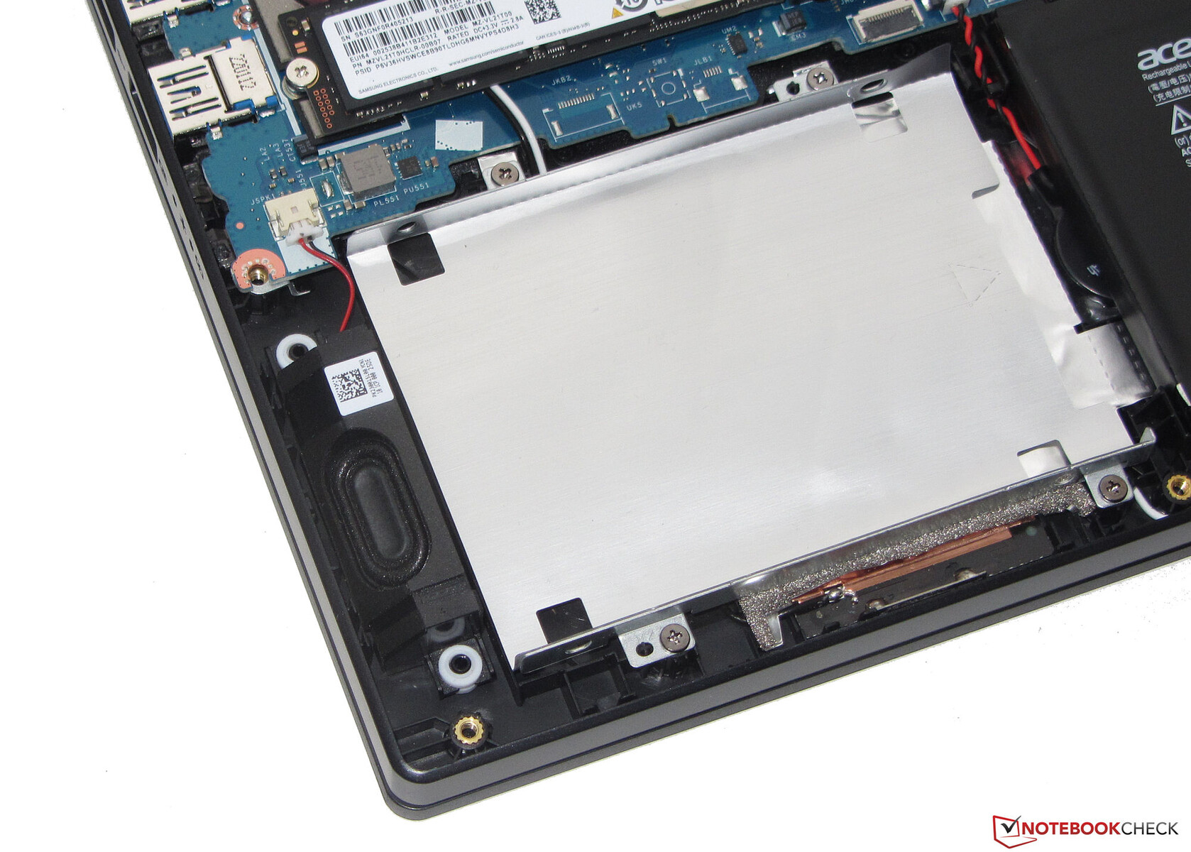 Nach Entfernung aller Schrauben auf der Geräteunterseite kann die Unterschale mit Hilfe eines flachen Spatels abgelöst werden. Hier muss mit Vorsicht vorgegangen werden: Die Unterschale sitzt recht fest. Anschließend besteht Zugriff auf die Arbeitsspeicherbänke (beide belegt), die SSD (PCIe 4), den zweiten M.2-2280-Steckplatz (PCIe 4), den 2,5-Zoll-Einbaurahmen, das WLAN-Modul, die Lüfter, die Lautsprecher und den Akku.