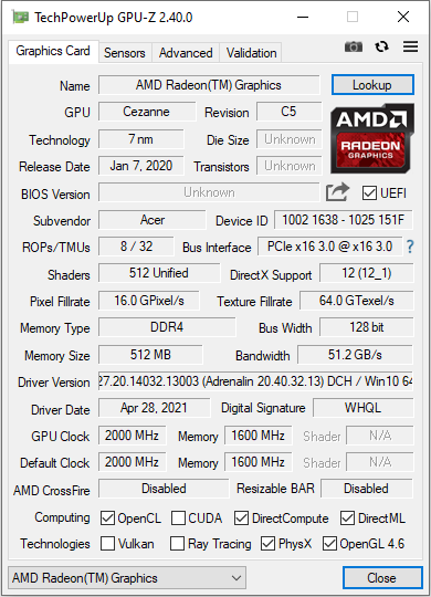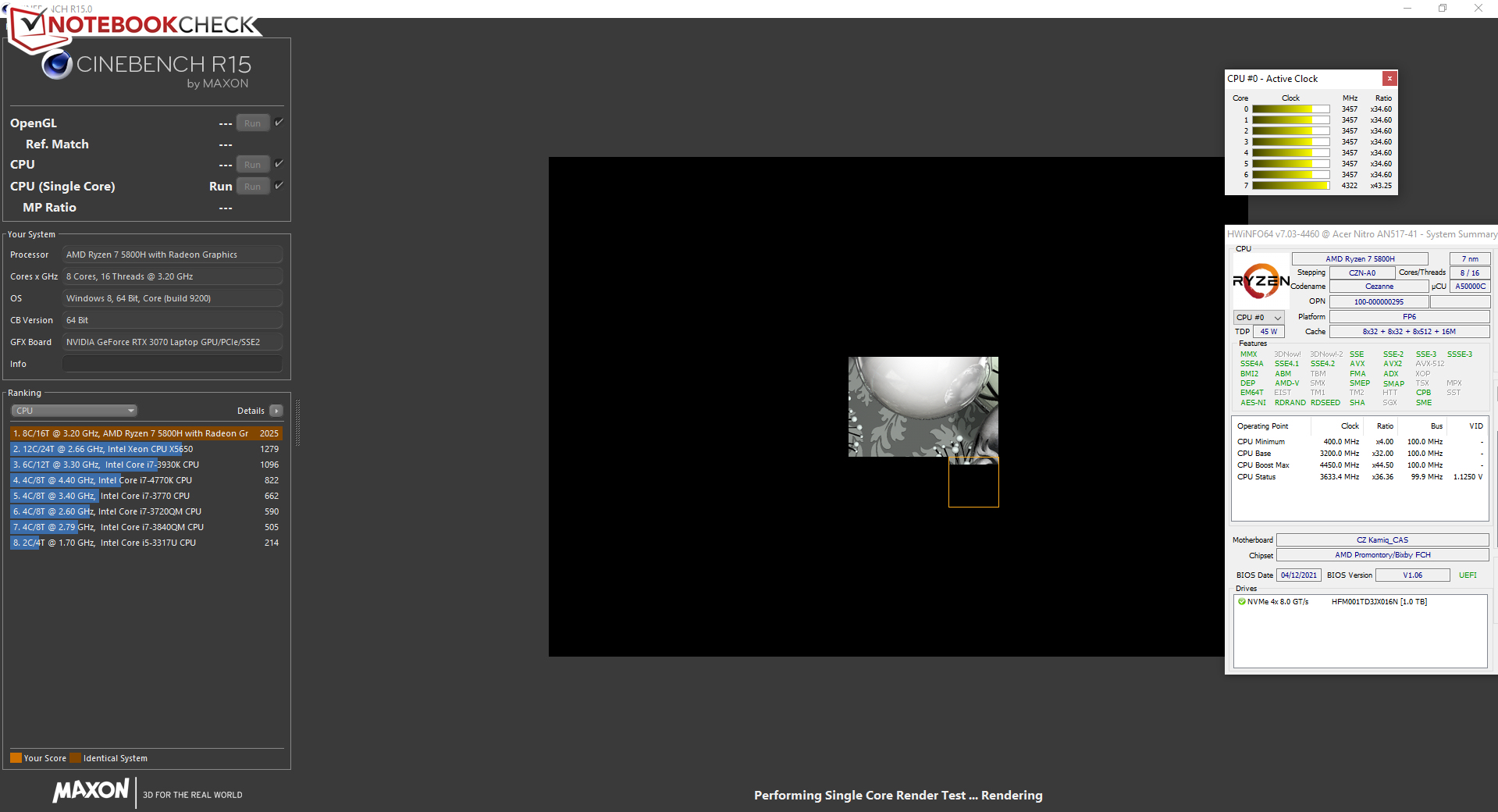 Der CPU-Teil der Ryzen-7-5800H-APU (Cezanne) besteht aus einem Achtkernprozessor, der mit einer Basisgeschwindigkeit von 3,2 GHz arbeitet. Mittels Turbo ist eine Steigerung auf bis zu 4,4 GHz möglich. Simultaneous Multithreading (pro Kern können zwei Threads bearbeitet werden) wird unterstützt.