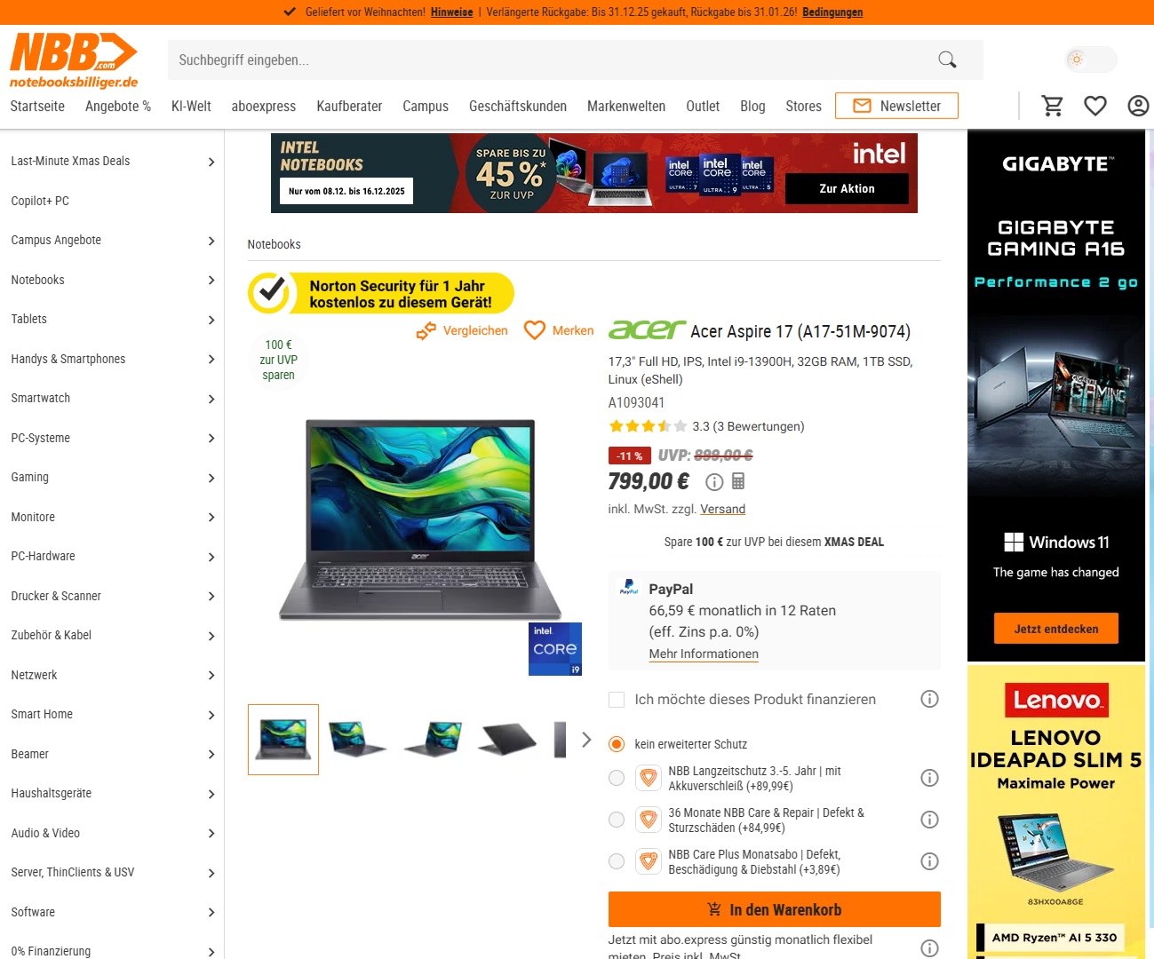 Acer gehört zu den Notebookherstellern, die die langsam aussterbende Kategorie der Office-Notebook im 17,3-Zoll weiterhin bedienen: Die Aspire-17-Reihe steht dabei für entsprechende Geräte des unteren bis mittleren Preissegments. Aktuell führt Notebooksbilliger.de mit dem Aspire 17 A17-51M-9074 ein Top-Modell der Serie zu einem Angebotspreis von 799 Euro im Sortiment. Ein Schwestermodell (mit dedizierter GeForce RTX 2050) ergatterte in unserem Test die Note "Gut (75 %)". Das sich im Angebot befindliche Aspire-17-Modell bringt keine dedizierte GPU mit.