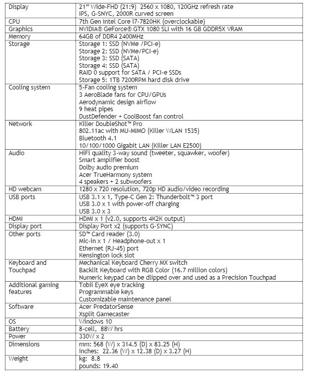 Die damit entstehende Hitze soll durch ein fünffaches Lüfter-System, drei Aero-Blades und neun Heat-Pipes aus dem Gehäuse entfernt werden. An Anschlüssen stehen ein USB-C Thunderbolt 3-Port, vier USB 3.0 Ports, ein HDMI 2.0-Port, zwei Display-Ports, Kartenleser, Ethernet-Port und natürlich Audio-Ein-und-Ausgang zur Verfügung. Das hintergrundbeleuchtete mechanische Keyboard mit RGB Color kann zwischen Touchpad und Zahlenblock wechseln, Tobii Eye-Tracking ist natürlich mit integriert, ebenso wie Acer's True Harmony System und ein Hifi-System mit Drei-Wege-Boxen, bestehend aus vier Lautsprechern mit zwei Subwoofern. Killer LAN sowie Killer WLAN-Module und Bluetooth 4.1 runden die Ausstattung ab. Das ganze System wird von einem 8-Zellen 88Wh-Akku am Leben erhalten und wiegt 8,8 kg. Die Spezifikationen findet ihr unterhalb der Bilder.