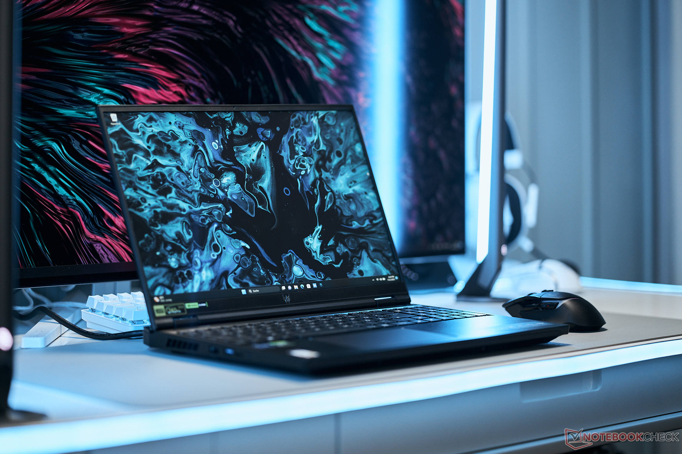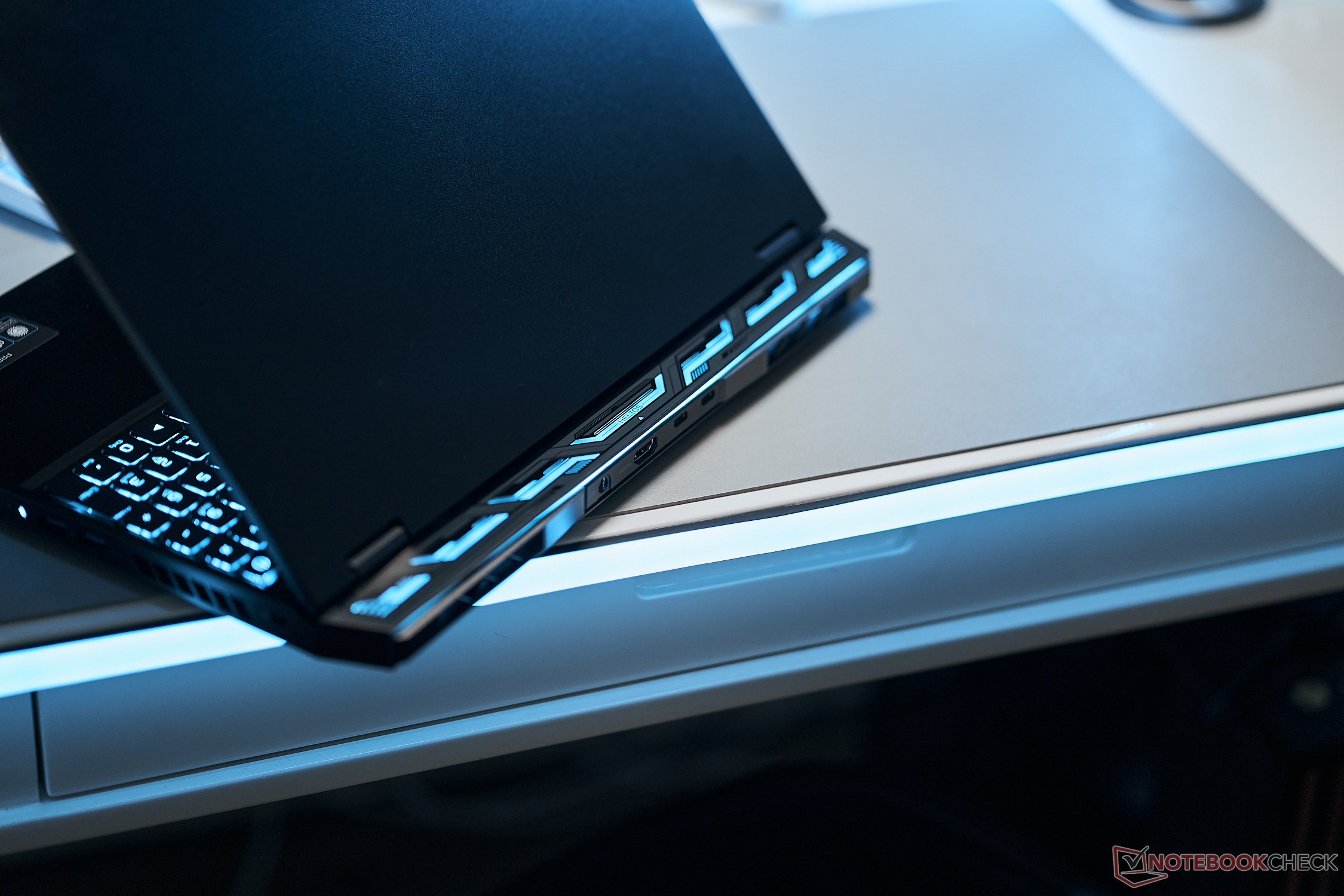 Zum Einsatz kommt ein Intel Core i7-13700HX (55-W-TDP), 16 GB DDR5-RAM (zwei RAM-Bänke) und eine 1-TB-SSD (PCIe-4.0). Obwohl auch ein Mini-LED-Display zur Auswahl steht, kommt unser Modell mit regulärem LED-beleuchtetem IPS-Panel, das unerwarteterweise dennoch auf High-End-Features setzt, wie unser Test zeigt.