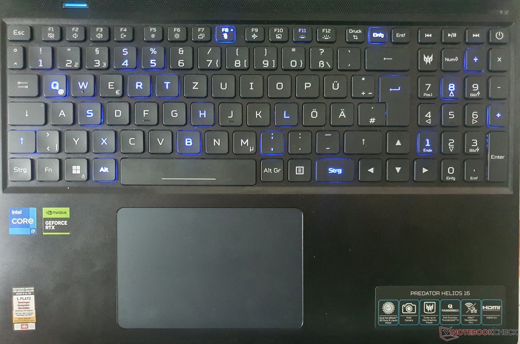Gefallen hat uns auch das Layout, insbesondere die normal großen Pfeiltasten, auf Kosten einer verkleinerten Shift. Während die Logo-Taste die Predator-Sense-App startet, wird mit der Taste links über der Tastatur zwischen den Leistungsmodi gewechselt.