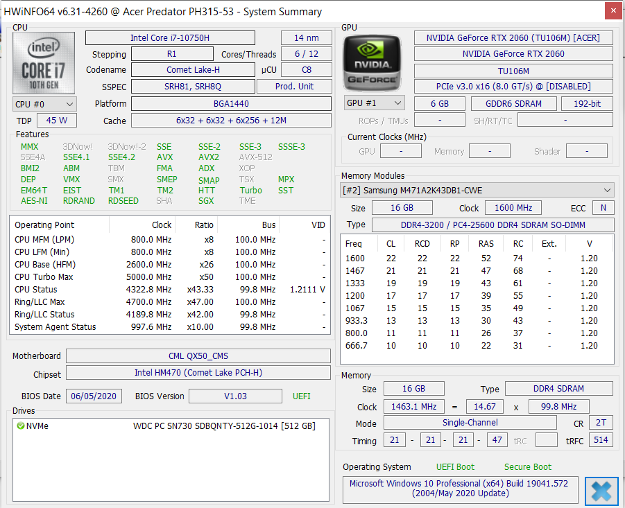 Der Core-i7-10750H-Sechskernprozessor (Comet Lake) arbeitet mit einer Basisgeschwindigkeit von 2,6 GHz. Per Turbo kann der Takt auf 4,3 GHz (sechs Kerne) bis 5 GHz (ein Kern) gesteigert werden. Hyperthreading (zwei Threads pro Kern) wird unterstützt.