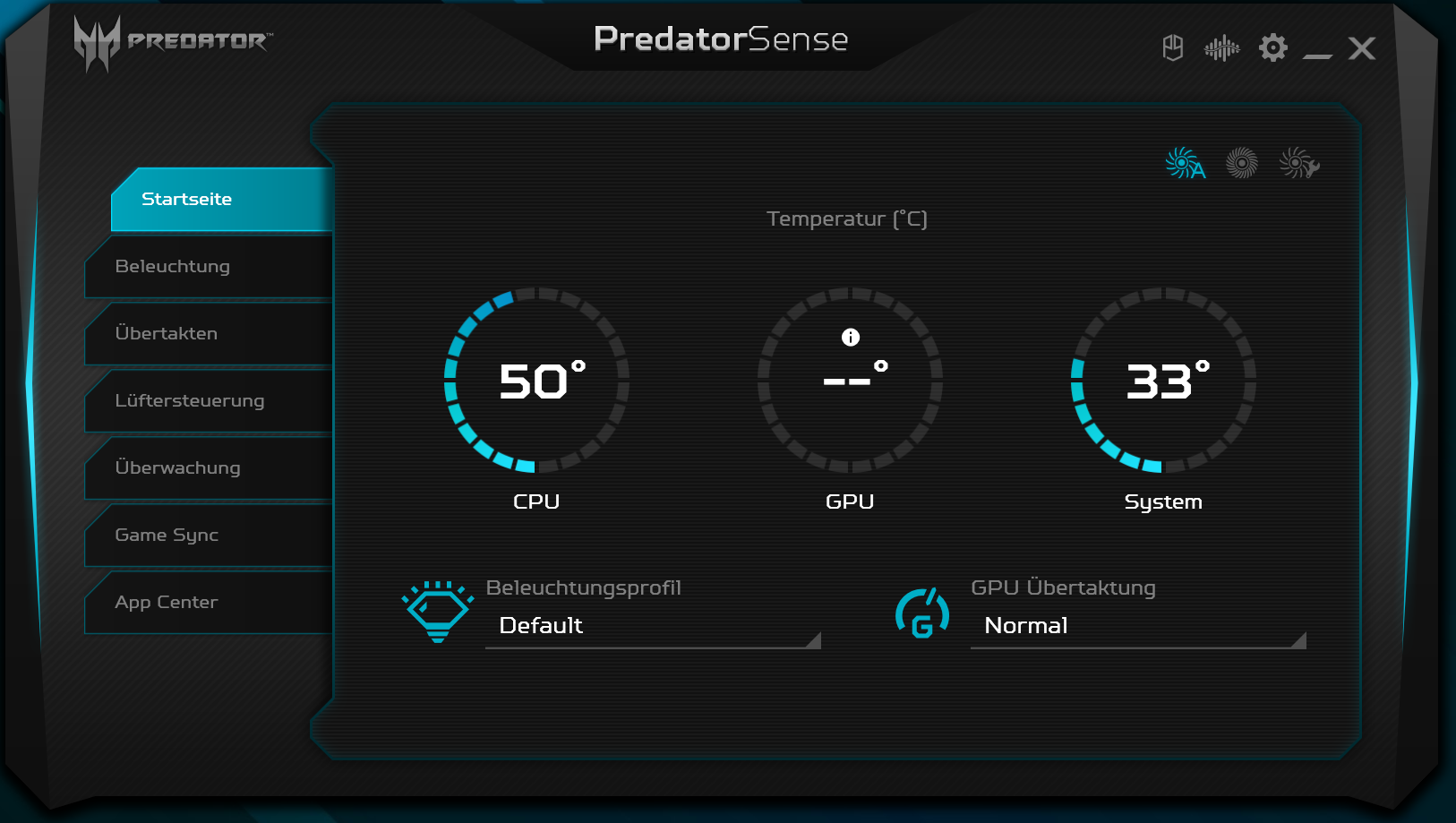 Die vorinstallierte Predator-Sense-Software ermöglicht die Anpassung der Lüftersteuerung und die automatische Übertaktung der GPU. Es stehen die GPU-Profile "Normal", "Schnell" und "Extrem" zur Auswahl. Wir haben unseren Test mit automatischer Lüftersteuerung und dem GPU-Profil "Normal" durchgeführt. Einige Benchmarks haben wir zusätzlich bei aktivem "Extrem"-Profil durchlaufen lassen.