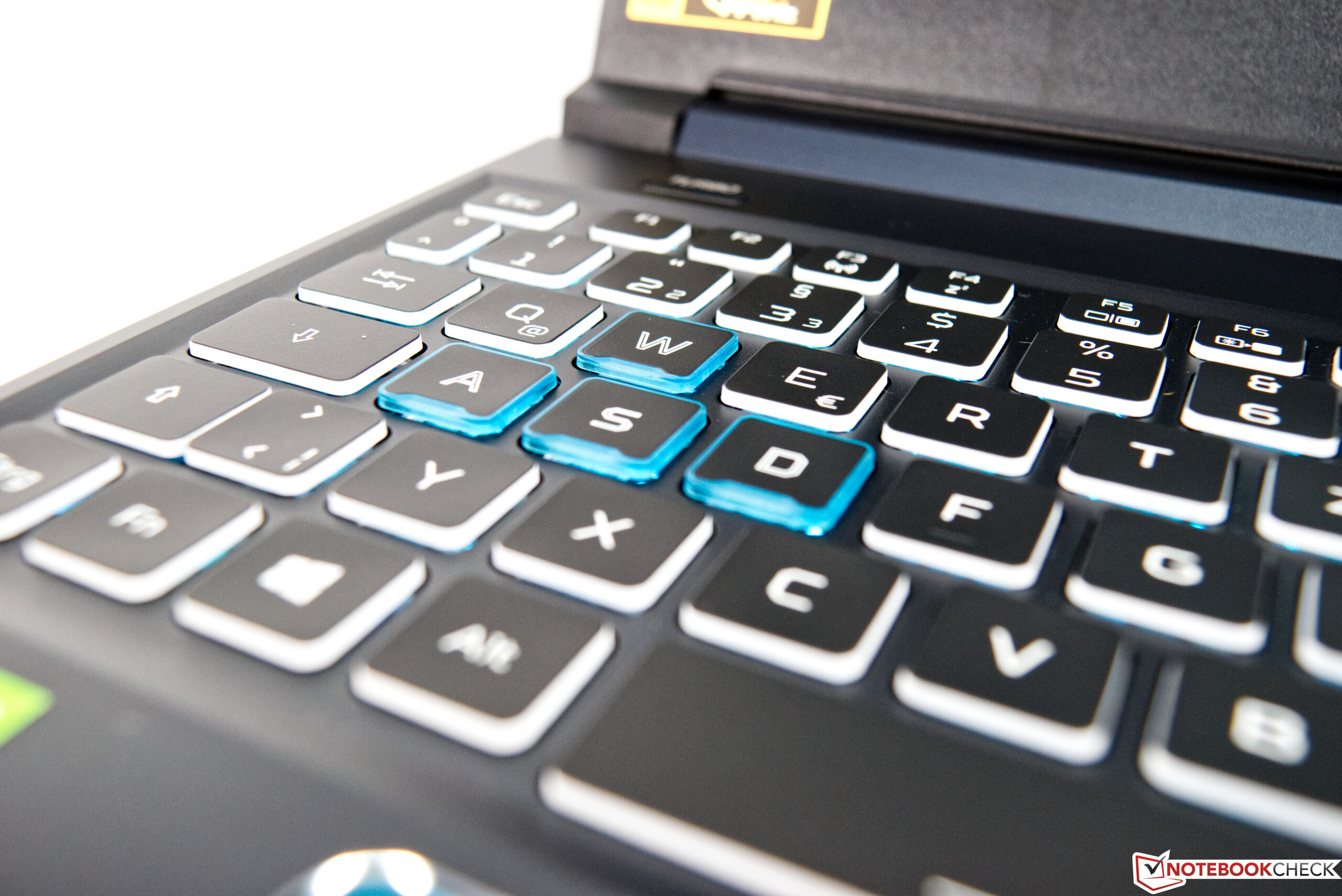 Acer verbaut beim Helios 300 PH315 eine 6-Zeilen-Chiclet-Tastatur, welche leicht abgesenkt in die Oberseite der Base eingearbeitet ist. 15 x 15 Millimeter messen die einzelnen Tasten in Höhe und Breite und bieten somit genügend Auflagefläche. Alle Tasten sitzen fest an ihrer Position und nichts klappert. Der Hubweg ist angenehm kurz und wird von einem deutlich spürbaren Druckpunkt begleitet. Der gedämpfte Anschlag sorgt für ein leises Tippgeräusch. Optisch dominieren hier auch wieder die Farben Blau und Schwarz. Gleichwohl kann die Hintergrundbeleuchtung in allen RGB-Farben leuchten. Markante Tasten wie beispielsweise W, A, S und D sind zusätzlich mit einem bauen Rand hervorgehoben. Das gilt auch für die Pfeiltasten und die Predator-Taste, welche beim Betätigen das Tool Predator Sense öffnet.