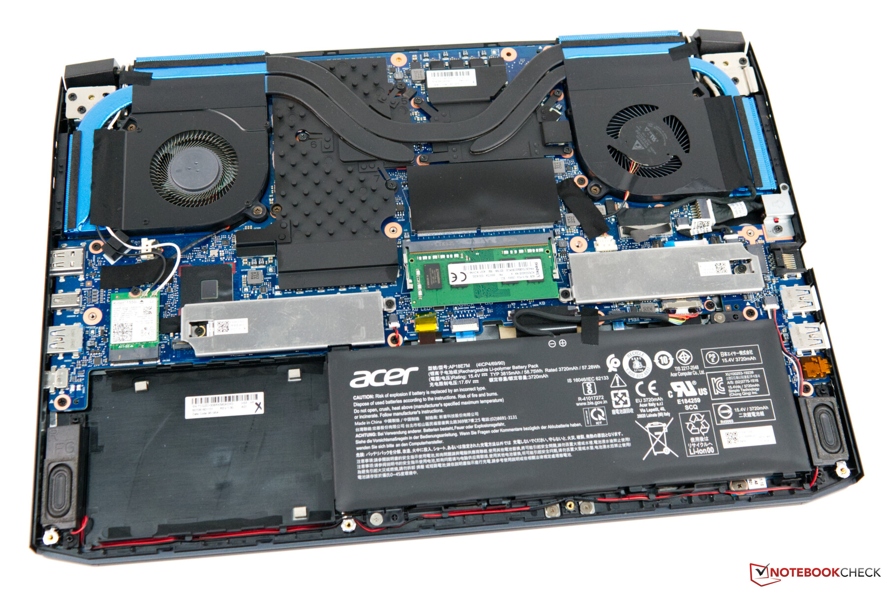 Auf eine große Wartungsklappe verzichtet Acer beim Helios 300. Das ist aber nicht schlimm, denn die Demontage der unteren Abdeckung ist kein Problem. Nach dem Entfernen gelangt man gut an die verbauten Komponenten. Da unser Testgerät nur mit einer M.2-SSD ausgestattet ist, können noch zwei weitere Massenspeicher installiert werden. Ein M.2.2280 sowie der 2,5-Zoll-Schacht ist noch frei. Das passende Anschlusskabel für den 2,5-Zoll-Schacht befindet sich übrigens ebenfalls im Lieferumfang und muss nicht separat gekauft werden.