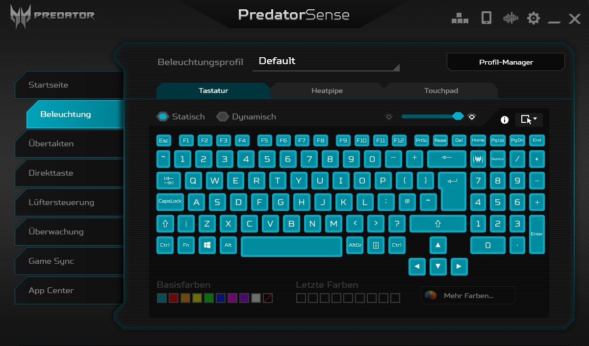 Als weiteres Highlight entpuppt sich die mehrstufige und relativ gleichmäßige RGB-Beleuchtung, die sich individuell anpassen lässt (inklusive bunter „Disko-Modi“). Kleiner Wermutstropfen: Die Sekundärfunktionen der einzelnen Tasten müssen ohne Licht auskommen. Neben der Tastatur werden übrigens auch das Touchpad, das Glasfeld zwischen den Lüftern und das Logo auf dem Deckel beleuchtet, was die Orientierung erleichtert.