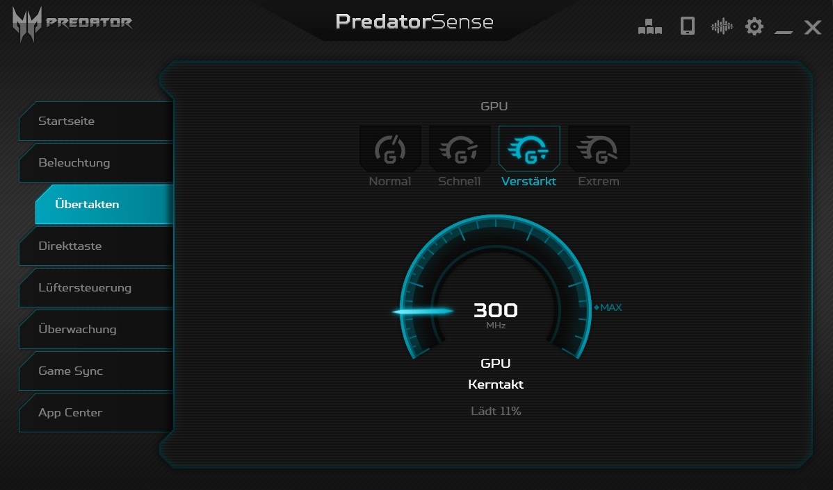 Tunging-Fans dürfen sich nicht nur über austauschbare Tasten, sondern auch über ein Tool namens PredatorSense freuen. In insgesamt 8 Menüs können Nutzer zahlreiche Einstellungen an Soft-, Hardware und Gehäuse vornehmen sowie das System überwachen. Besonders (test)relevant ist dabei das Menü „Übertakten“, welches die Leistung oder genauer gesagt den Turbo der GPU beeinflusst. Während für Idle-Messungen der Modus „Normal“ aktiv war, verwendeten wir für Lastmessungen den Modus „Verstärkt“. Letzterer aktiviert sich automatisch, sobald man die Eingabegeräte ausklappt und die Kühlöffnungen freilegt. Als Lüftersteuerung kam stets der „Auto“-Modus zum Einsatz.