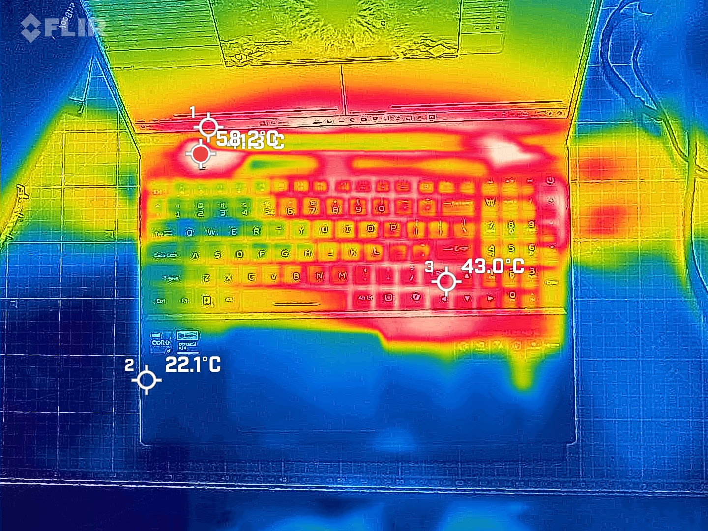 (+) Die Handballen und der Touchpad-Bereich sind mit gemessenen 24.6 °C kühler als die typische Hauttemperatur und fühlen sich dadurch kühl an.