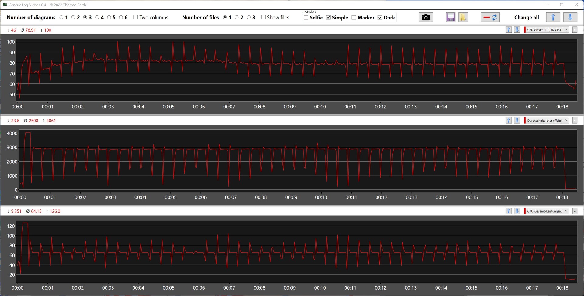 Einen guten ersten Einblick hinsichtlich der Effizienz in Verbindung mit der eingebauten Kühlung bekommen wir bei der Cinebench-R15-Dauerschleife. Nach dem ersten Durchlauf sinkt die Leistung drastisch, denn das erhöhte PL2 kann nur beim ersten Durchlauf länger gehalten werden, als bei den weiteren Durchläufen. Die aufgezeichnete CPU-Metrik während des Tests zeigt dies sehr gut.