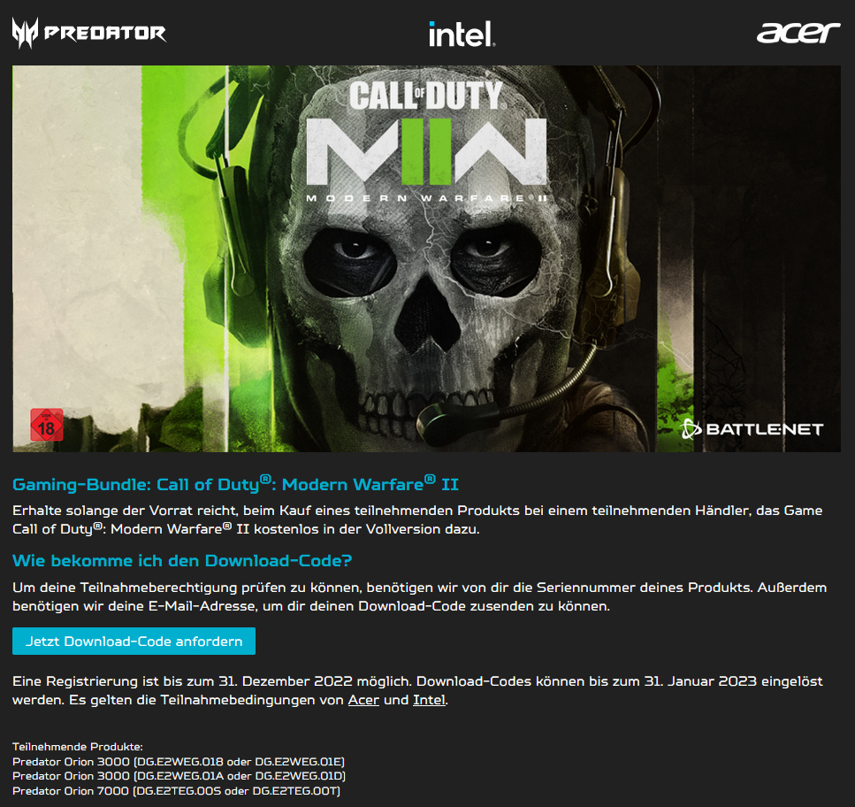 Call of Duty: Modern Warfare II gibt es für Käufer der obigen Acer-Modelle bis zum 31.12.2022 als Code gratis dazu. Gleichzeitig lässt sich Xbox Game Pass Ultimate inklusive EA Play für einen Monat kostenlos nutzen. Um kostenlos an den neuen Actionhit zu kommen, müssen Code für Call of Duty Modern Warfare 2 inklusive Seriennummer des Rechners auf der Aktionsseite von Acer eingelöst werden.