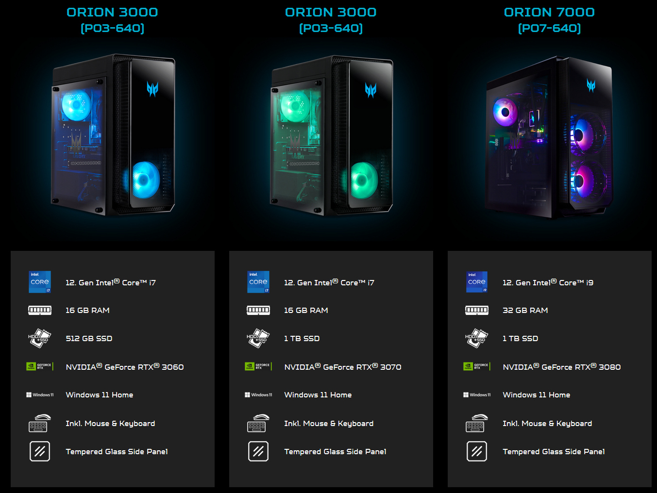 Der Predator Orion 3000 kommt in mehreren Varianten daher: Das Modell PO3-640 bietet als DG.E2WEG.018 und DG.E2WEG.01E mit 12. Gen Intel Core i7-12700F Prozessor, Nvidia GeForce RTX 3070 Grafikkarte, 16 GB RAM und 1 TByte SSD viel Power für die Gaming-Action, die Modellvarianten DG.E2WEG.01A und DG.E2WEG.01D begnügen sich mit 512-GB-SSD und GeForce RTX 3060.