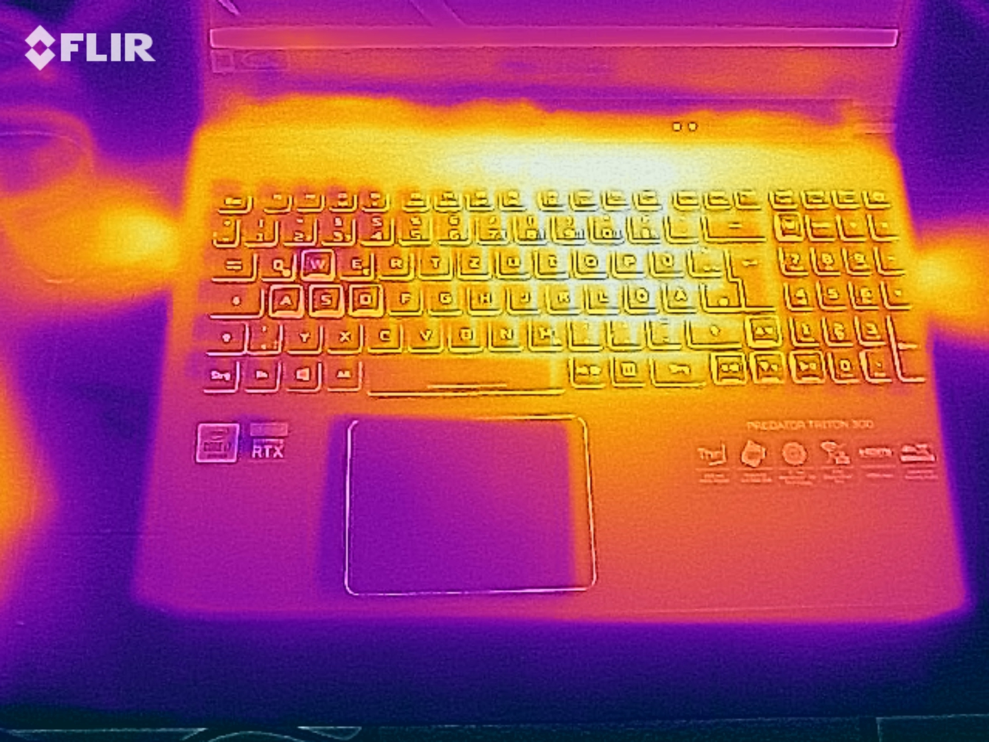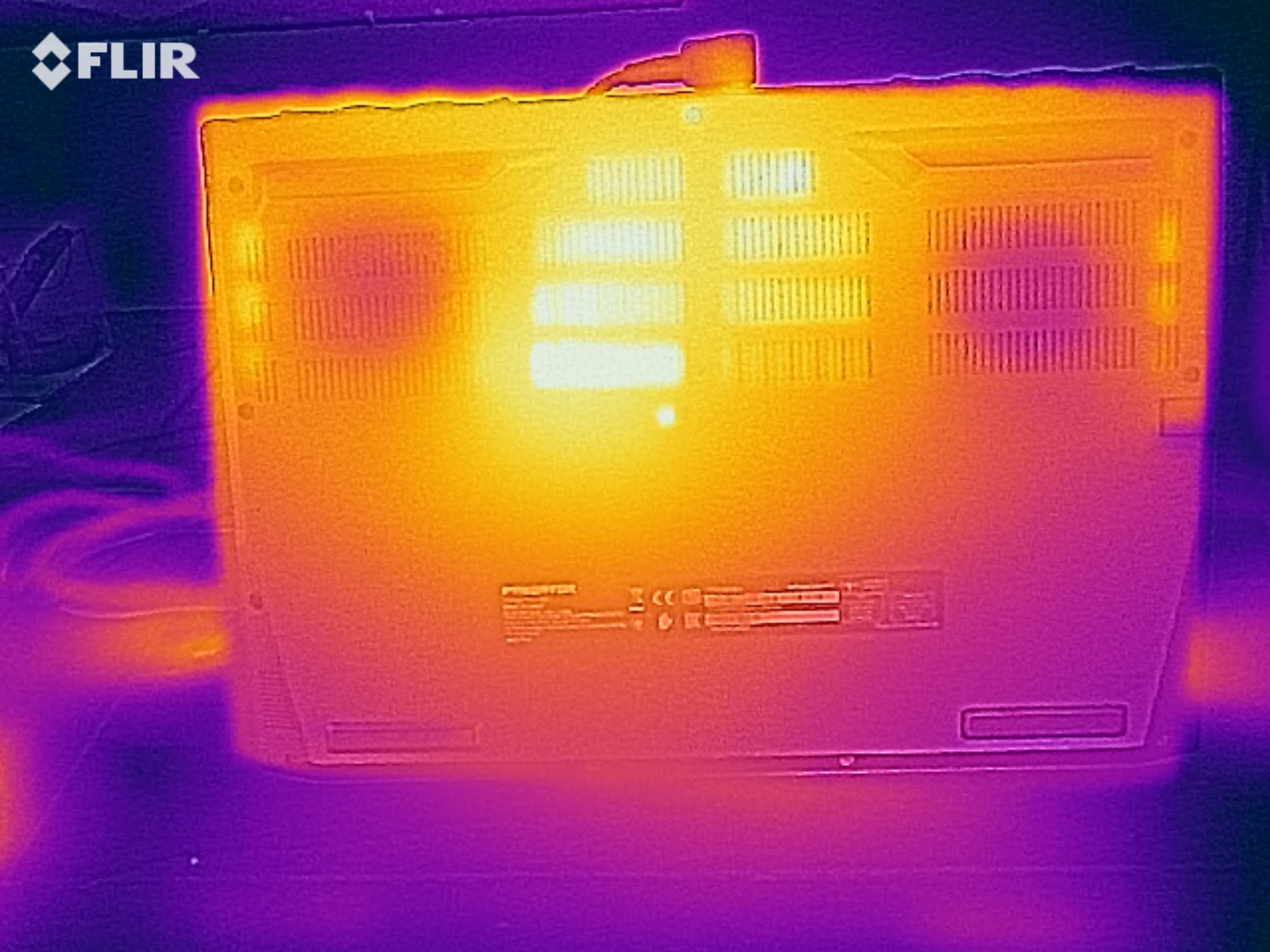 Unsere Messungen bescheinigen dem Triton 300 Oberflächentemperaturen von bis zu 65 °C unter Last. Der wärmste Punkt liegt dabei im mitteren Bereich der Unterseite. Auch die Handballenauflagen erwärmen sich, deren Temperaturen bleiben aber durchaus moderat.
