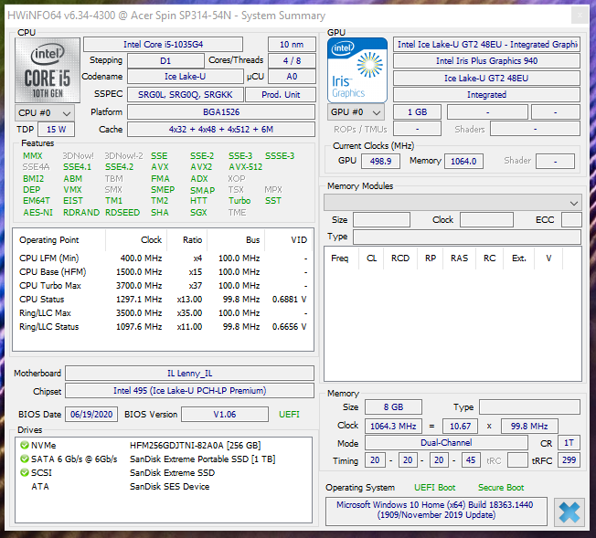 | 84.2 % v7 (old) | 03 / 2021 | Acer Spin 3 SP314-54N-56S5 i5-1035G4, Iris Plus Graphics G4 (Ice Lake 48 EU) | 1.5 kg | 16 mm | 14.00" | 1920x1080 | |