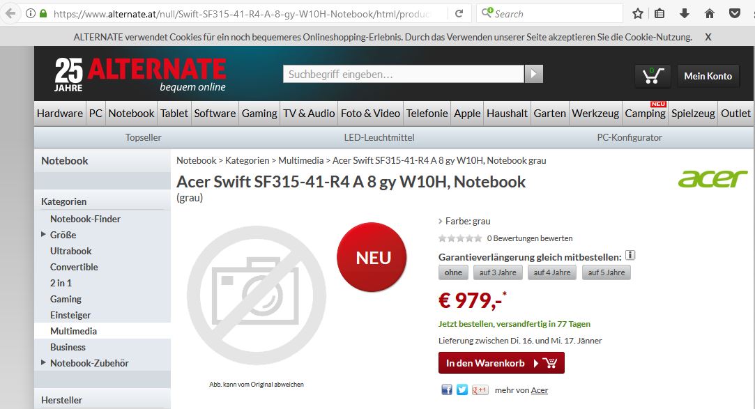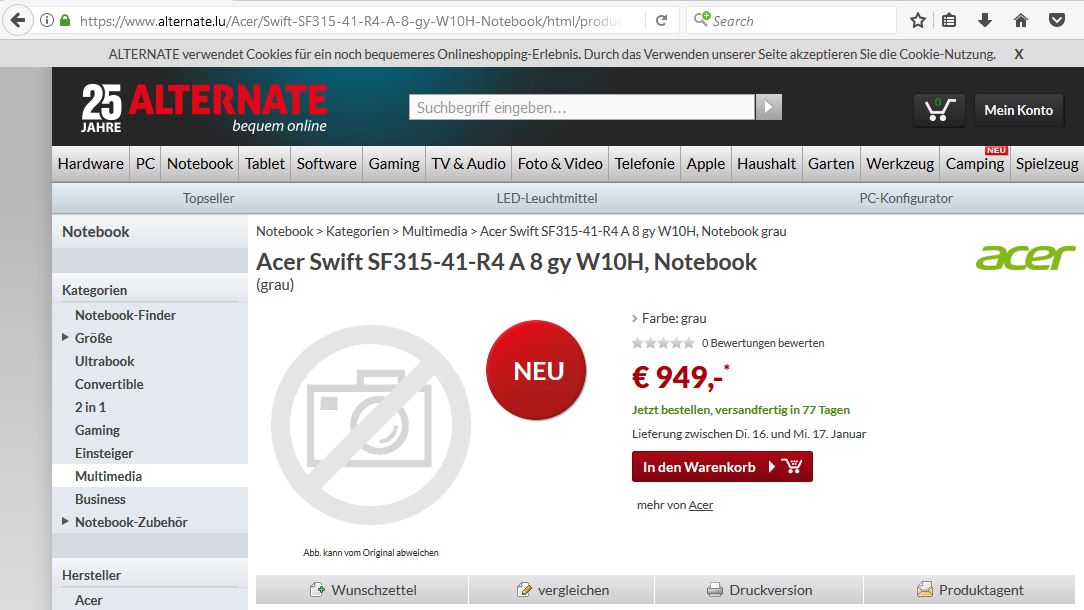 Sowohl Notebook als auch APU wurden noch nicht offiziell angekündigt, in den Alternate Stores von Österreich und Luxemburg wird allerdings eine Lieferung Mitte Januar angedeutet. Zum Notebook mit der Modellnummer "Acer Swift SF315-41-R4 A 8 gy W10H" sind keine weiteren Details gelistet, allerdings hat uns einer unserer Leser mit dem Namen "The Changed Man", auch noch auf diverse Geekbench-Einträge dieses Notebooks aufmerksam gemacht, denen wir weitere Informationen entnehmen können.