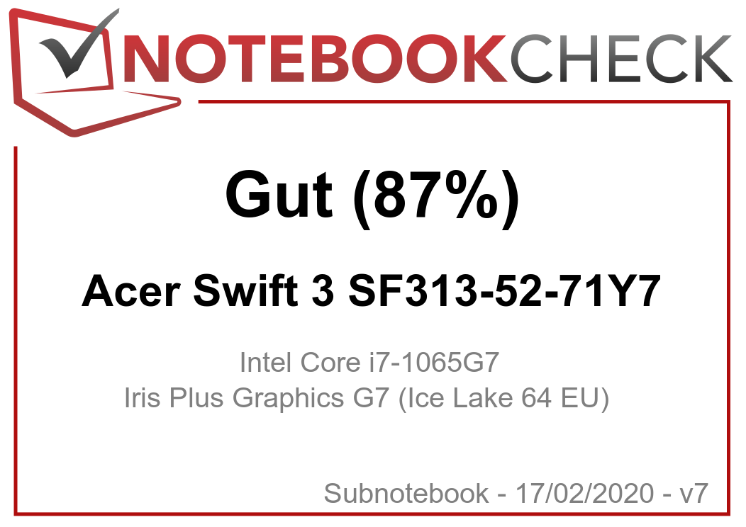 | 87 % v7 (old) | 02 / 2020 | Acer Swift 3 SF313-52-71Y7 i7-1065G7, Iris Plus Graphics G7 (Ice Lake 64 EU) | 1.2 kg | 16.6 mm | 13.50" | 2256x1504 | |